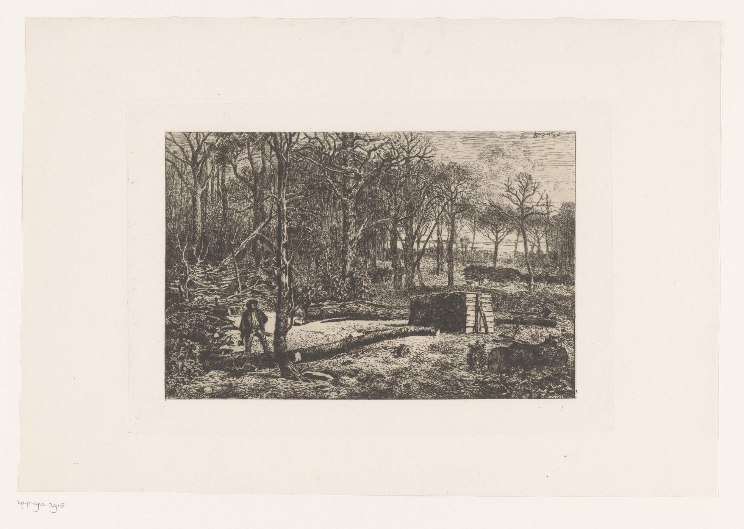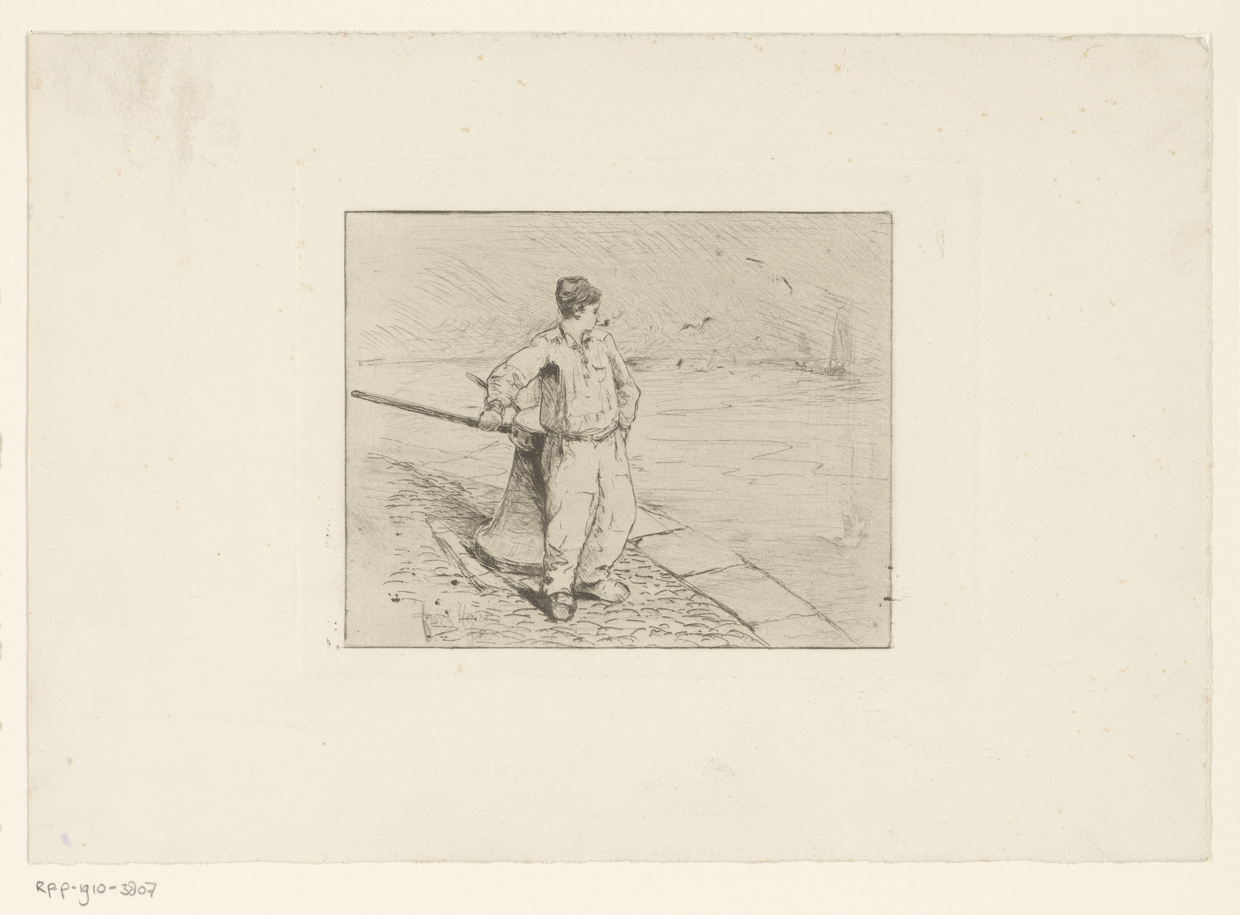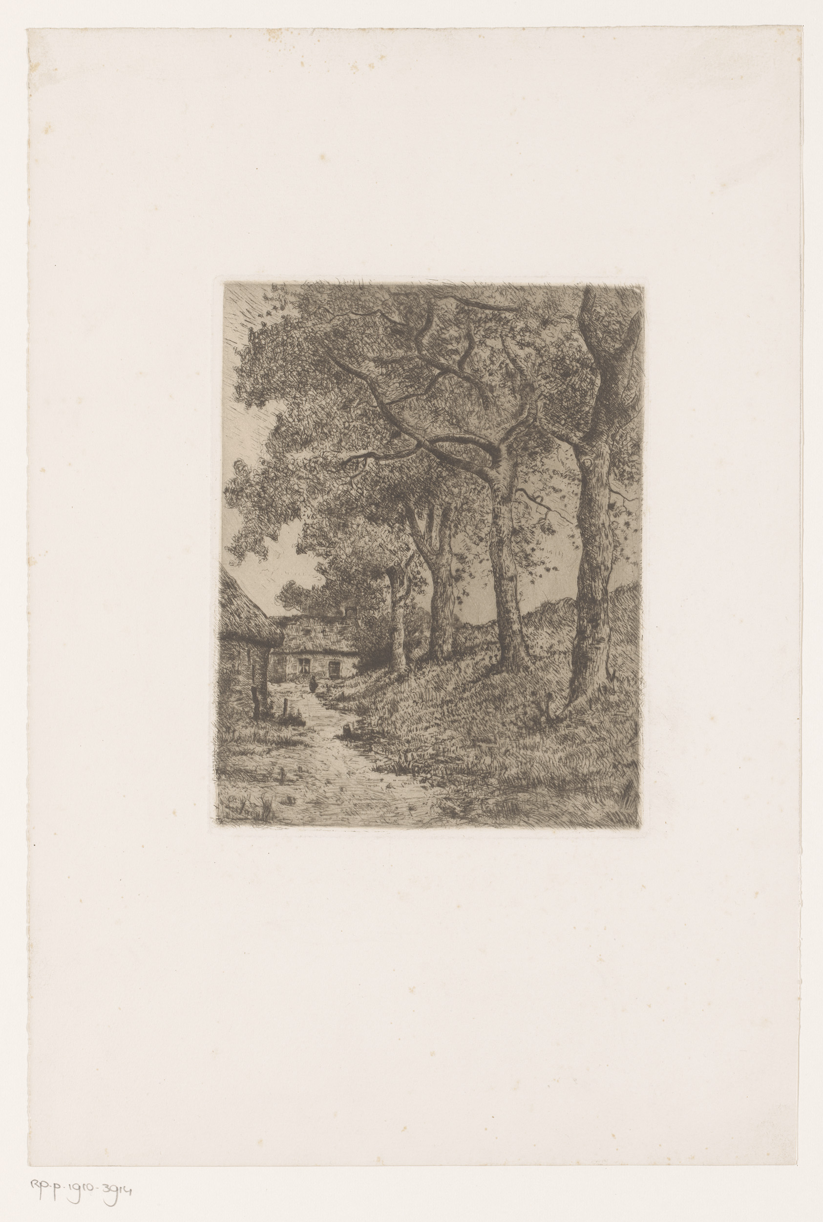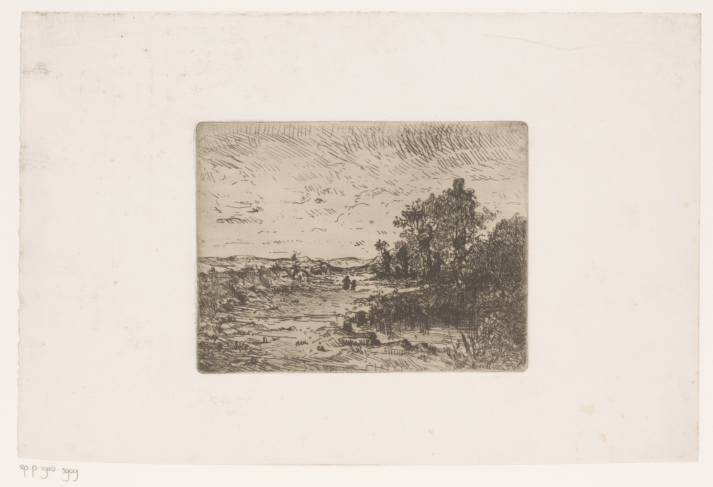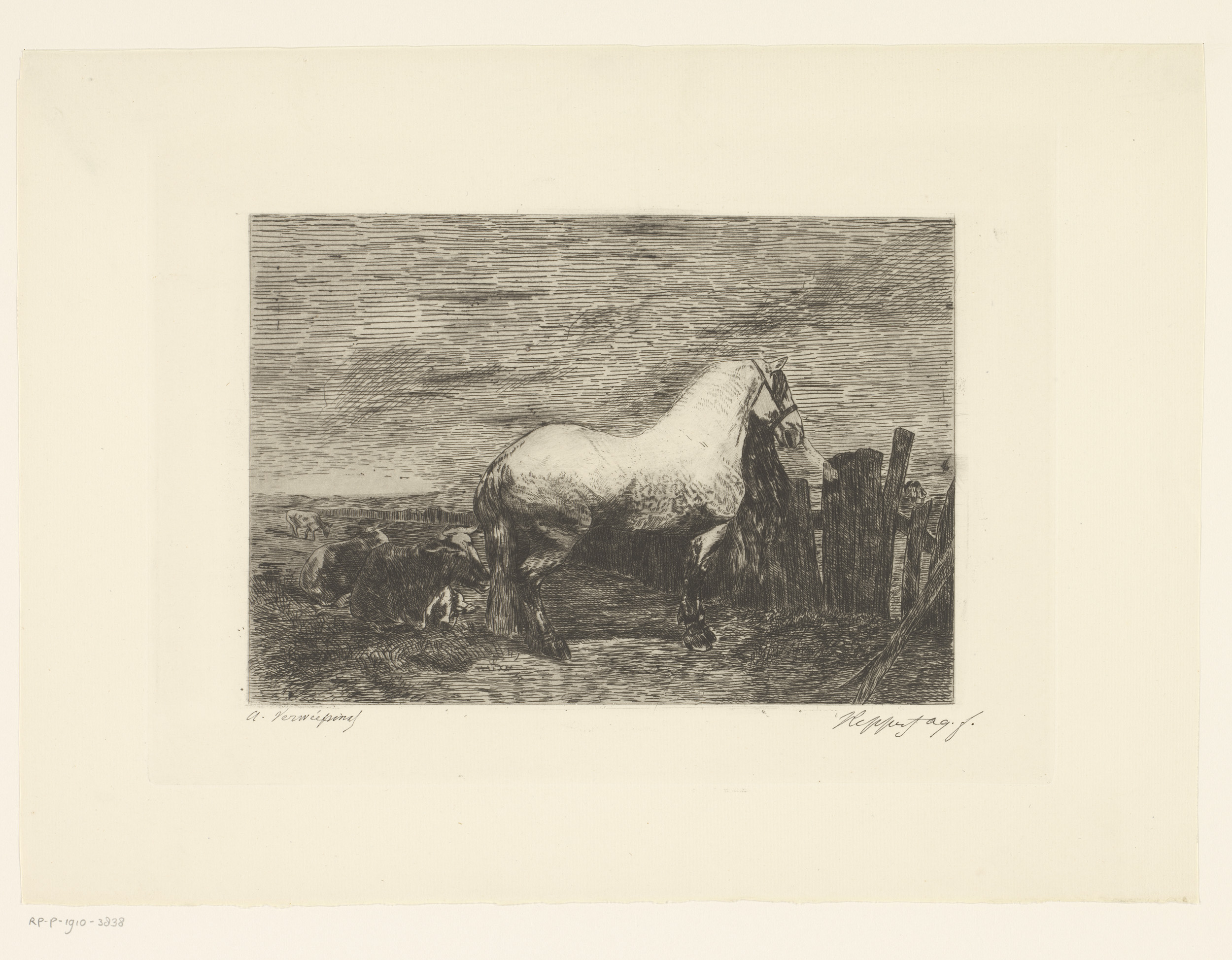 Man met pijp kijkt toe hoe een akker geploegd wordt ...