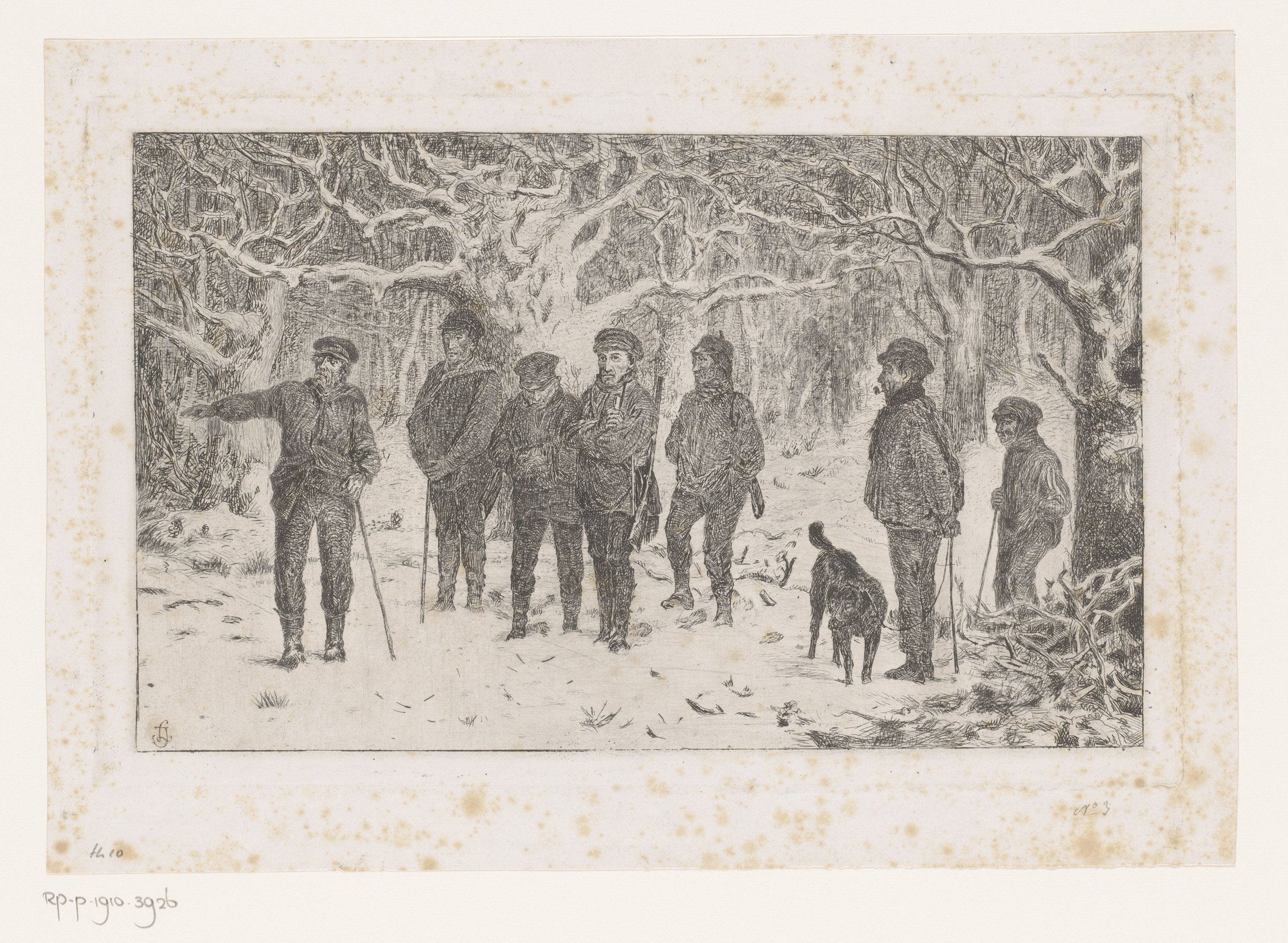 Troep soldaten, voorafgegaan door een hond, in de sn...