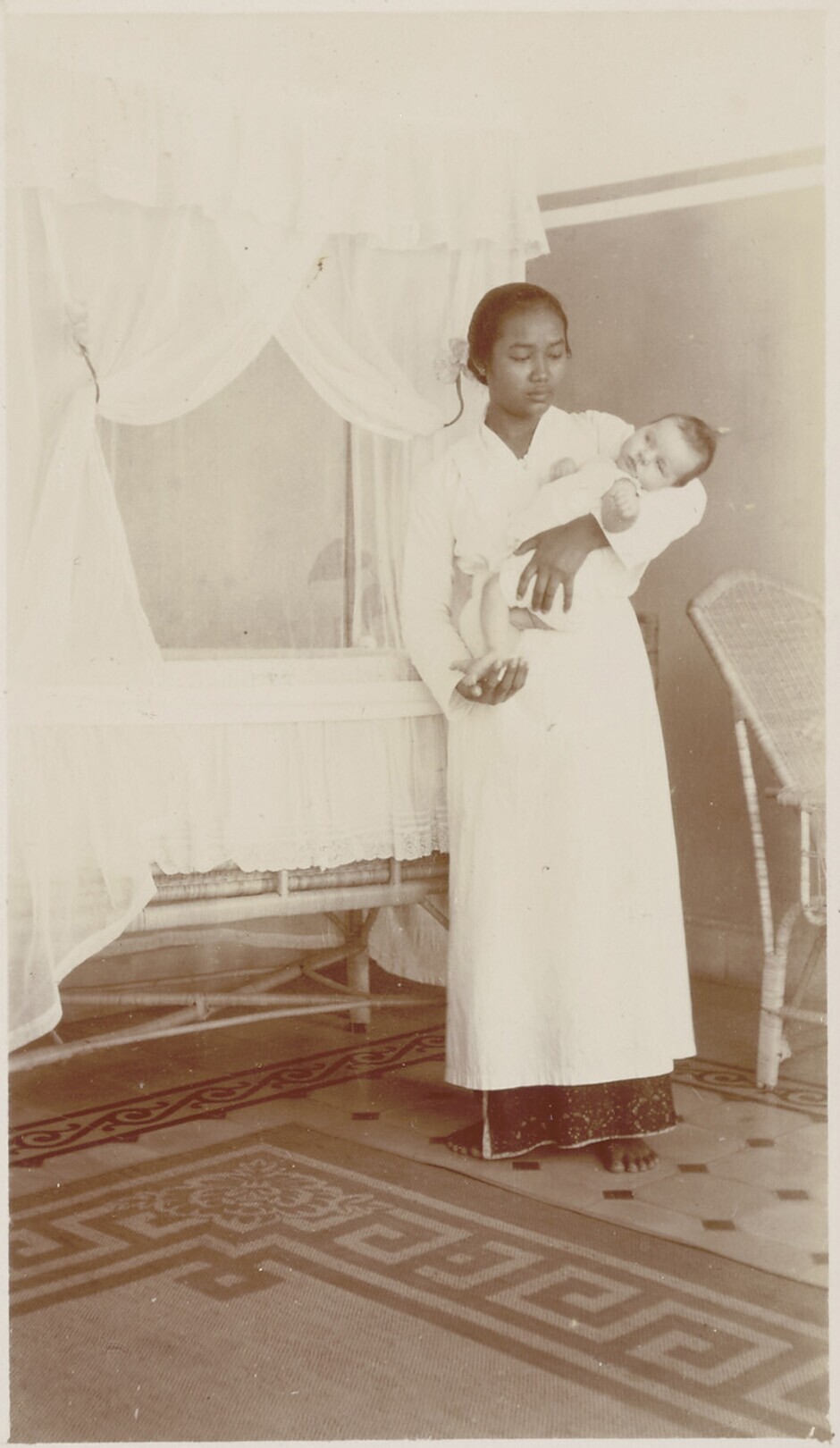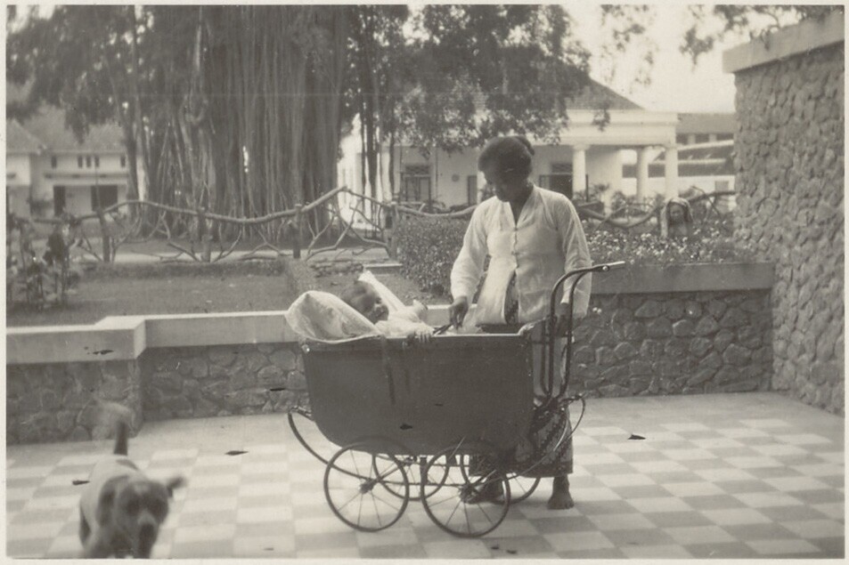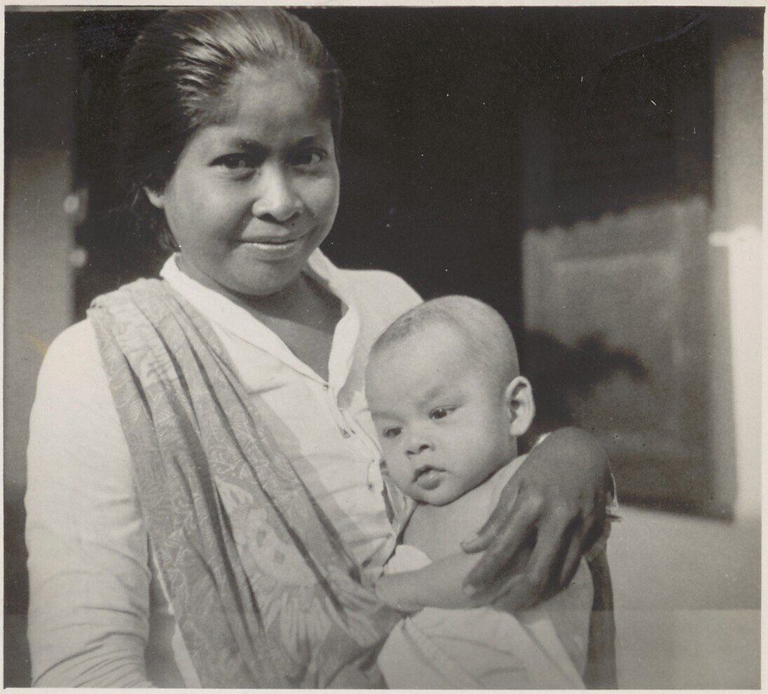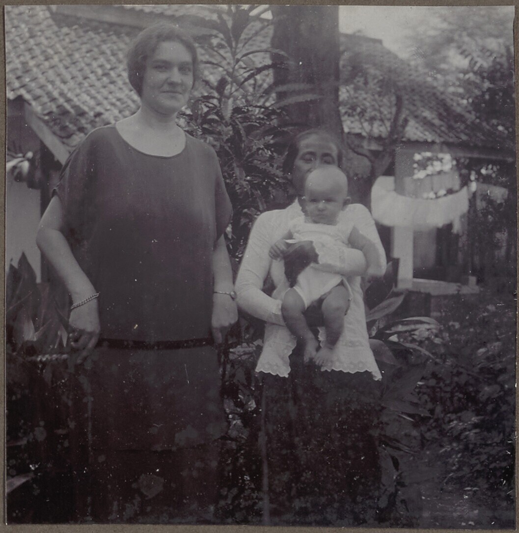 Baby, Pat van Deun, en kinderverzorgster voor het hu...