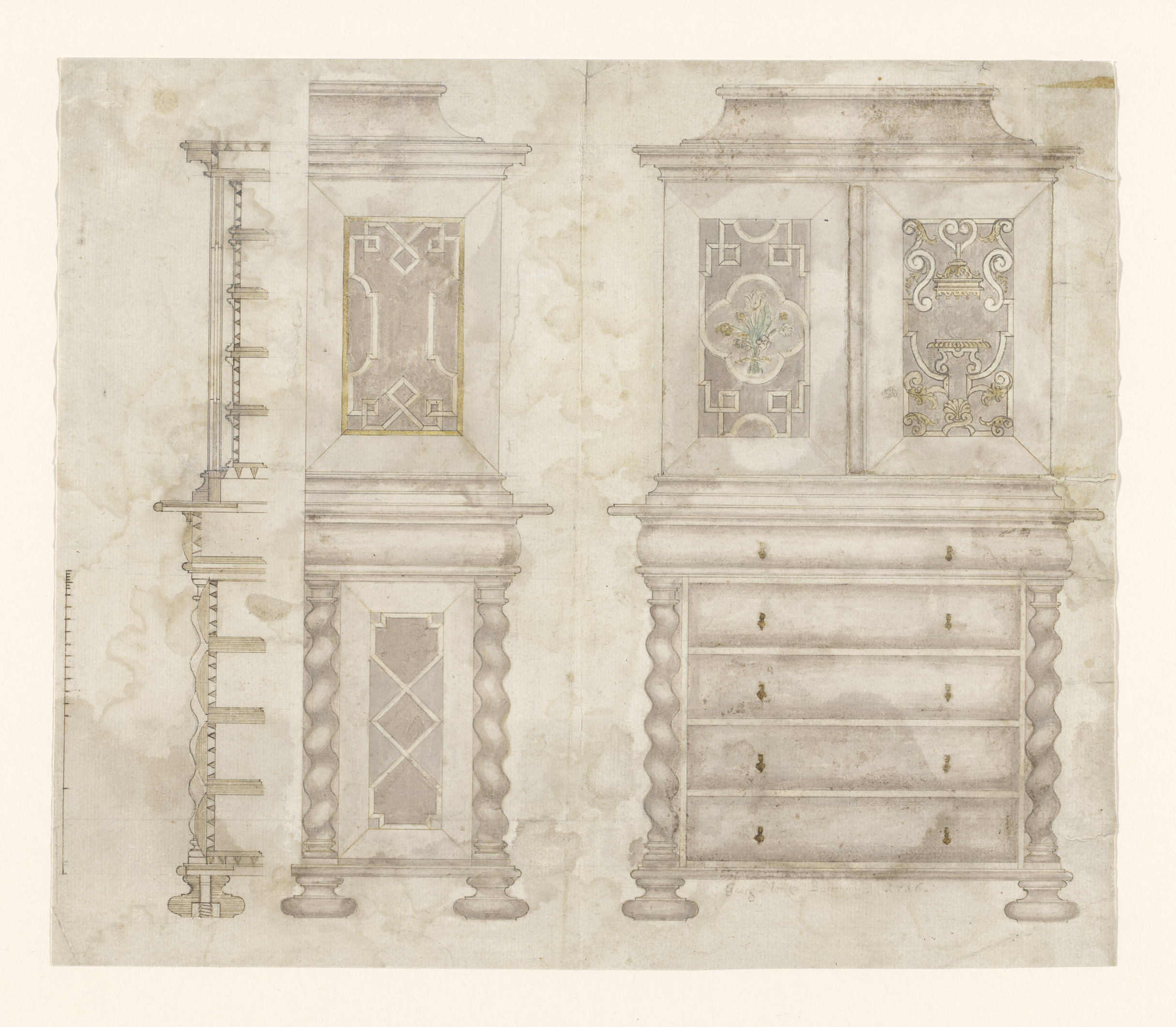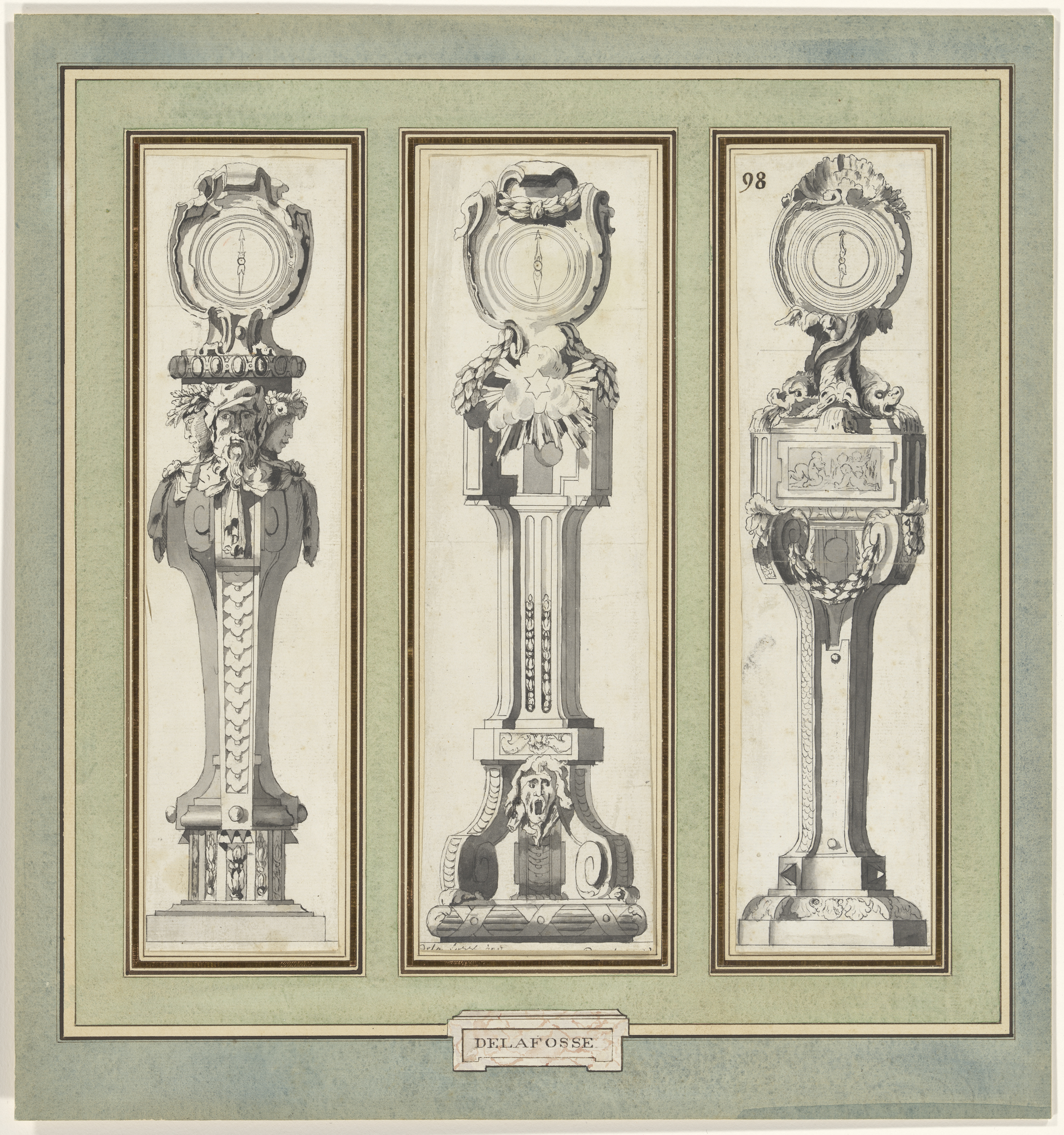 Ontwerp voor de kast van een staand horloge, met dri...