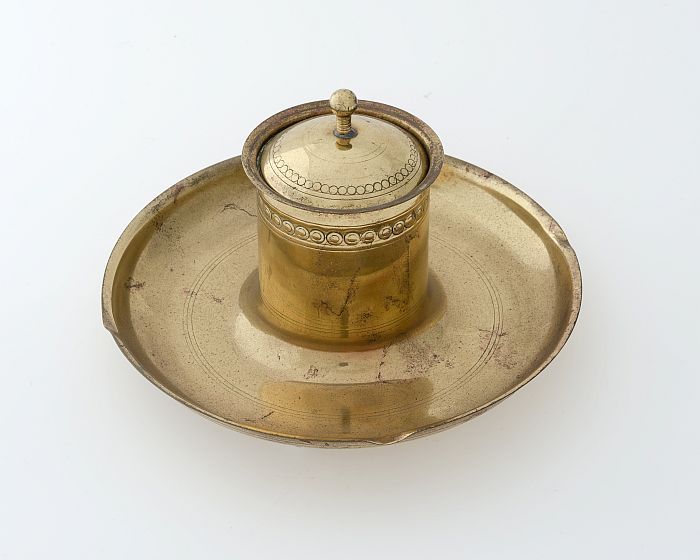 Cilindervormige inktpot met vaste schotel (A) en dek...
