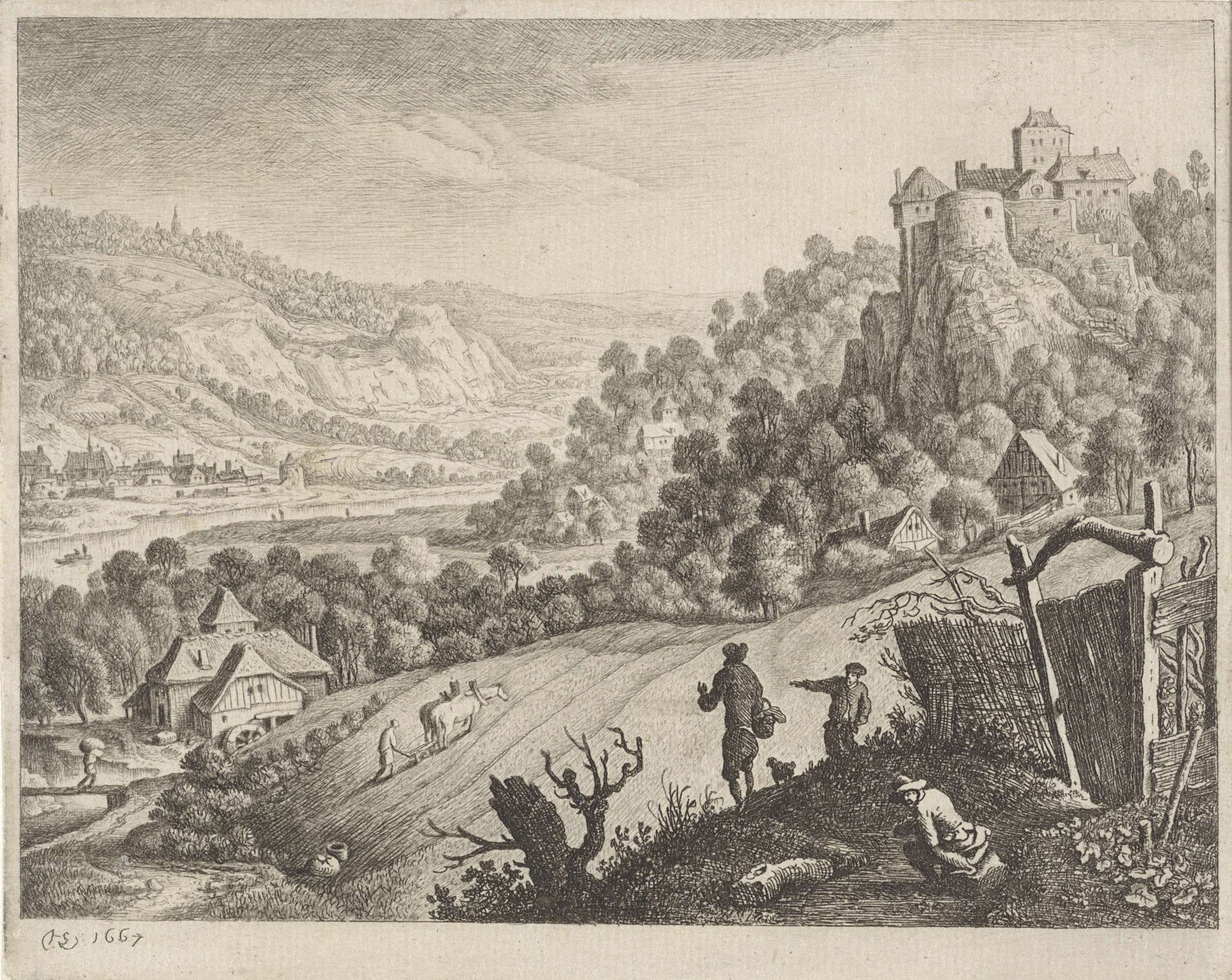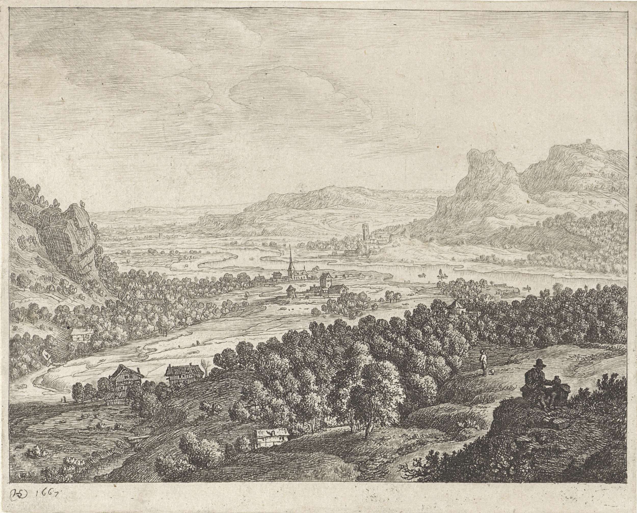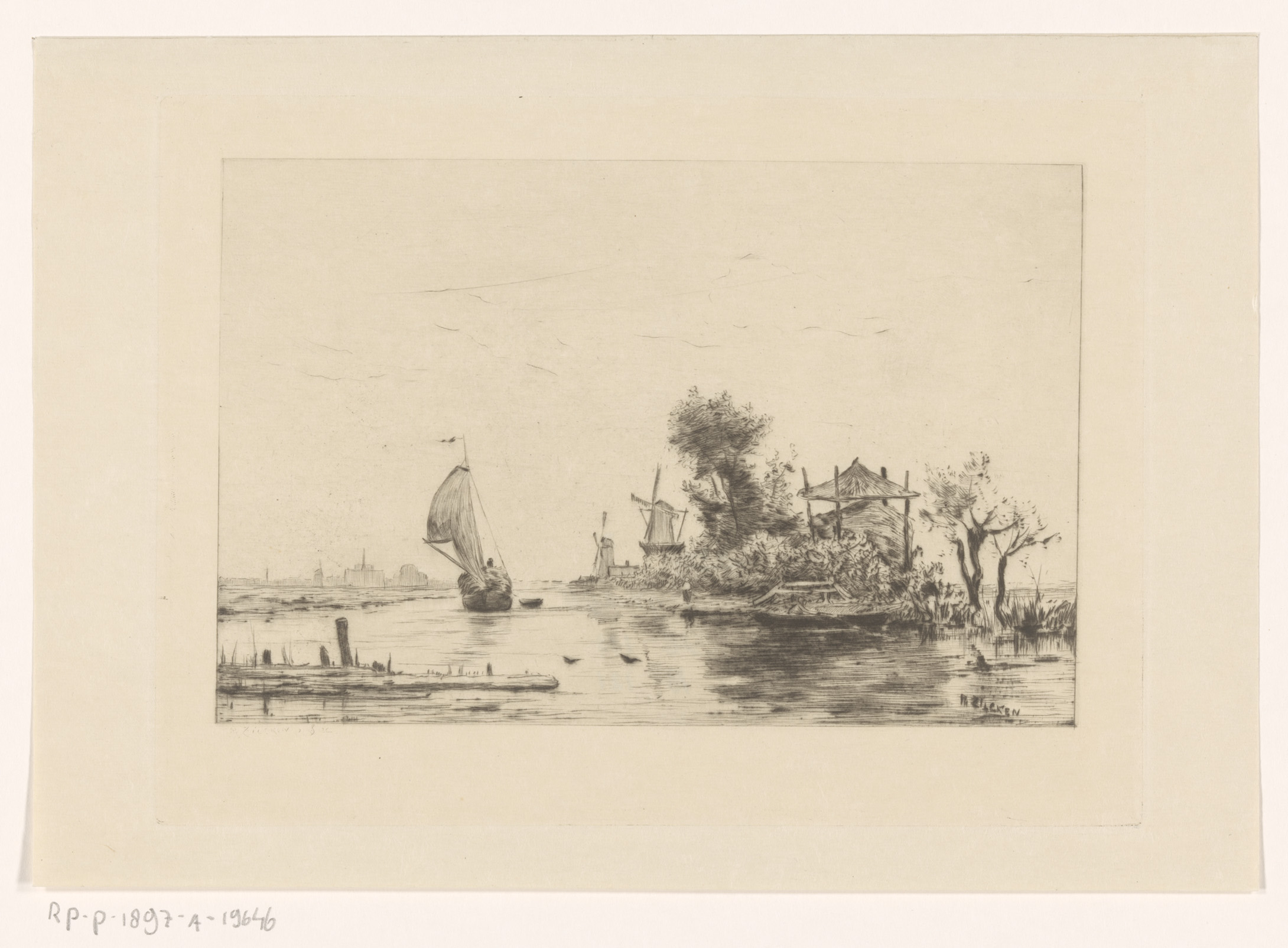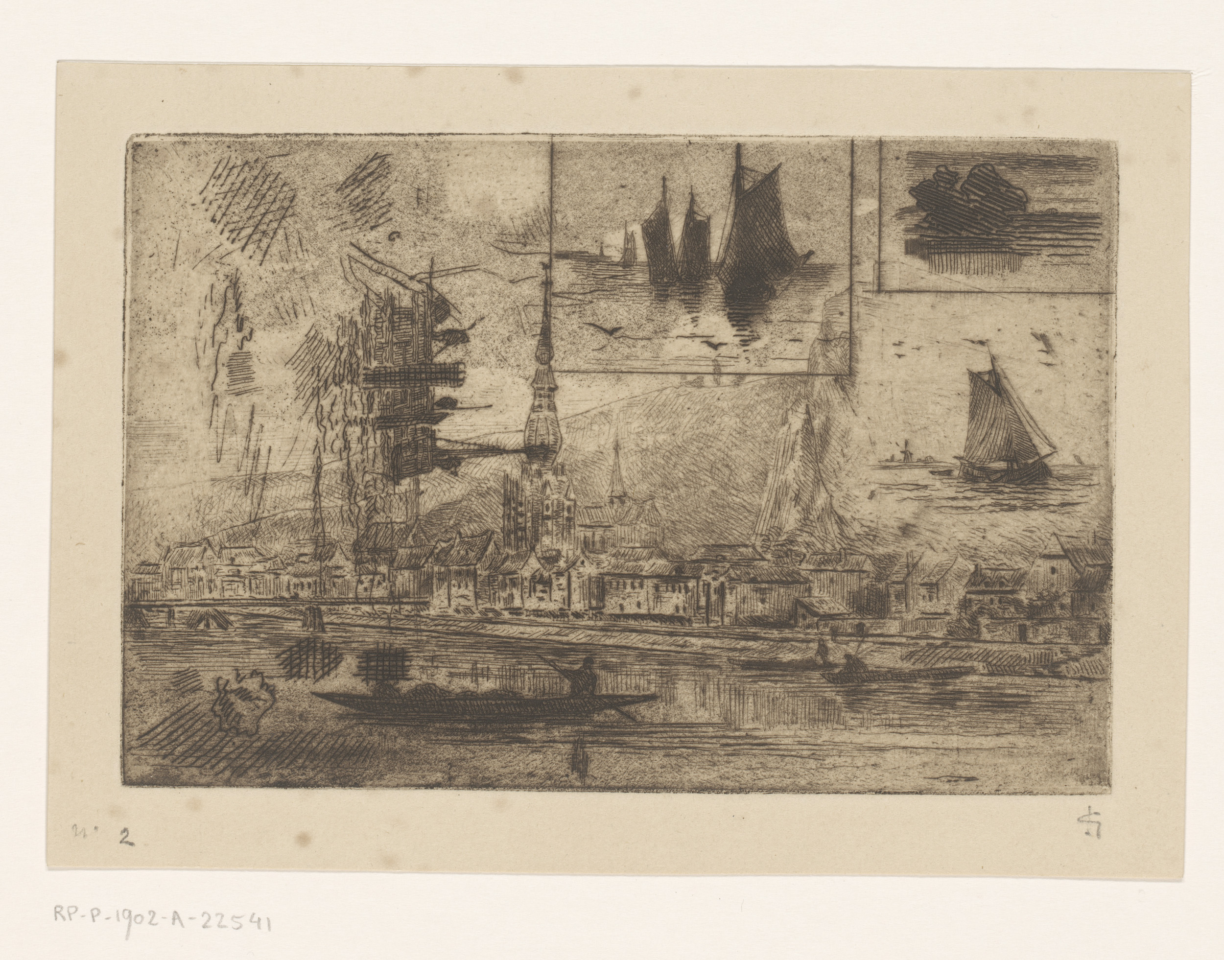 Gezicht op Dinant en zeegezichten met zeilschepen