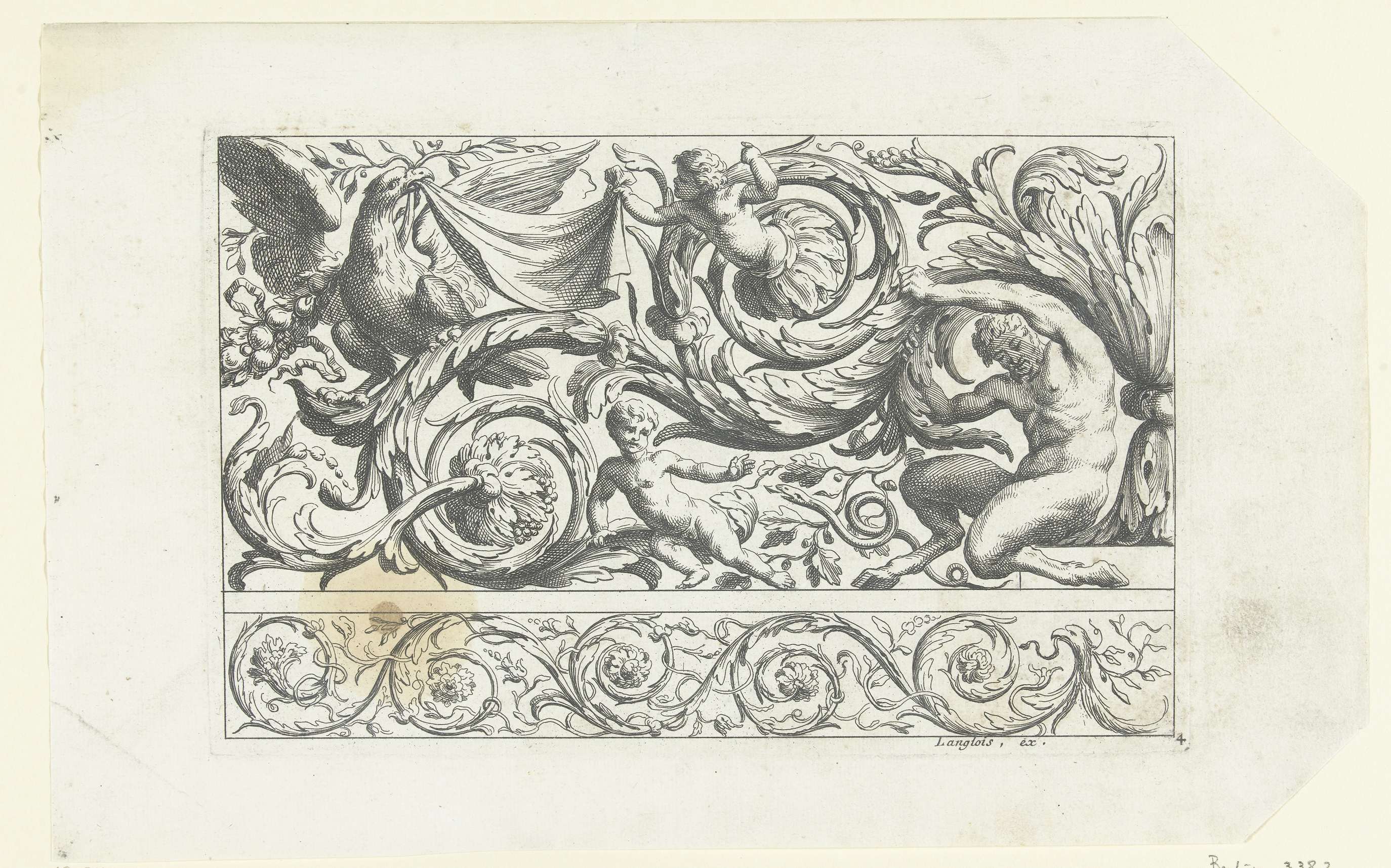 Sater, adelaar en twee putti tussen bladranken
