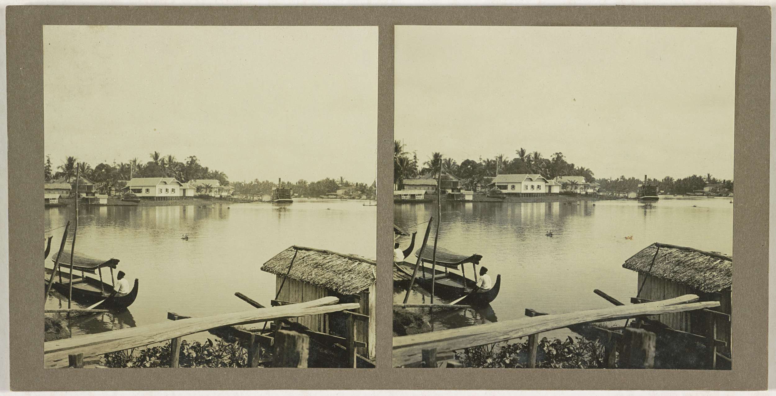 Gezicht op een rivier met drijvende hutten, vermoede...