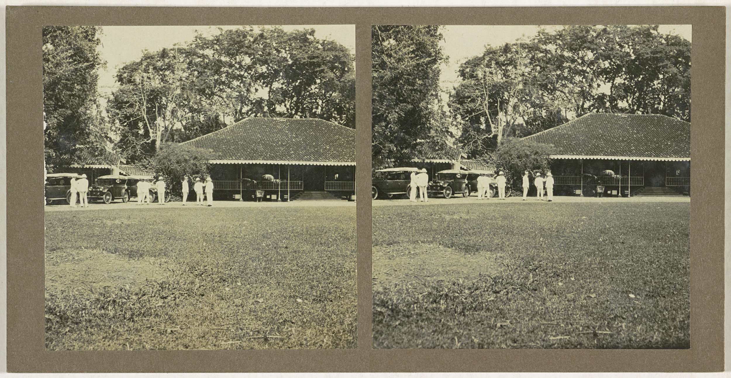 Landhuis met daarvoor enkele mannen en auto's, mogel...