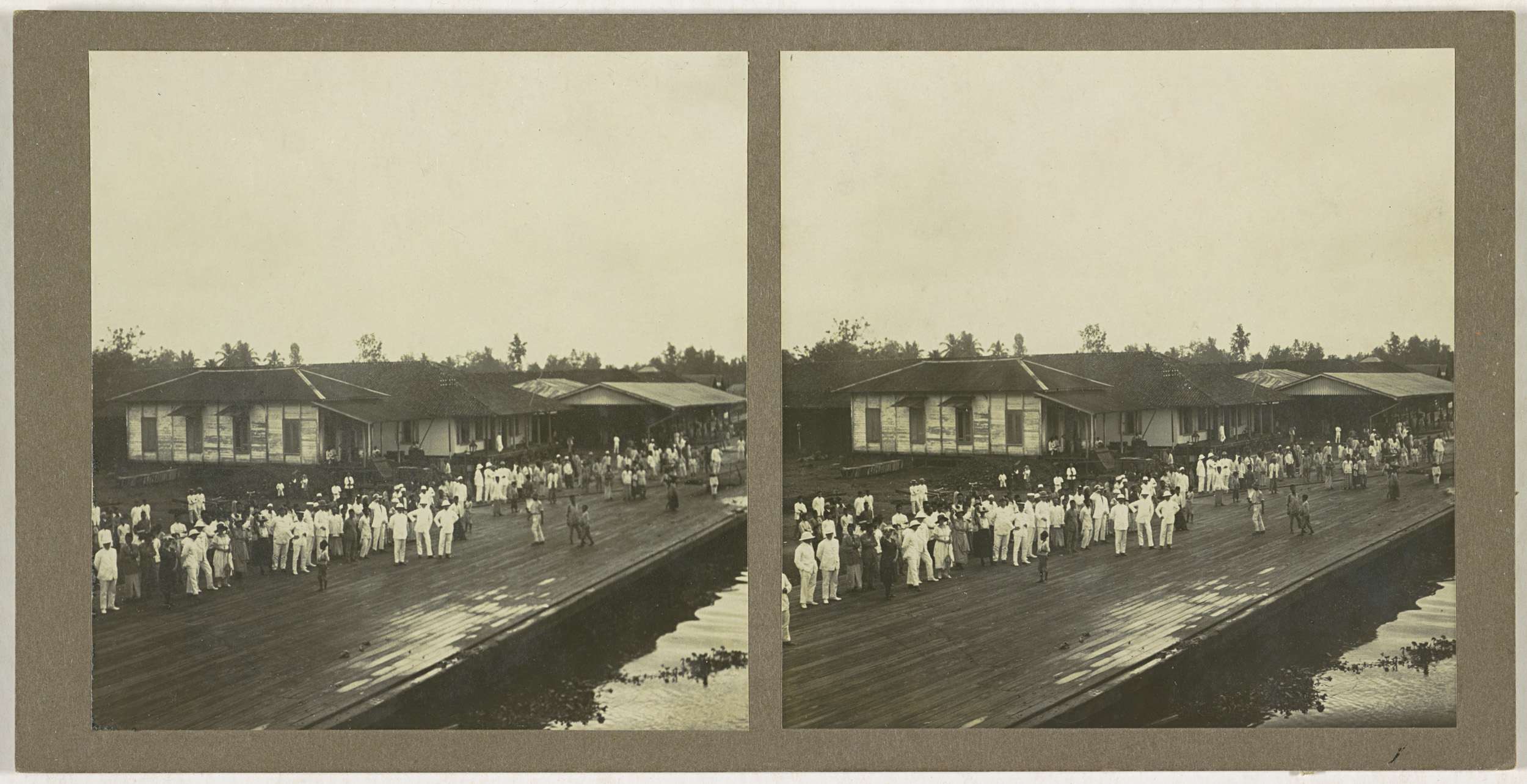 Menigte mensen op een houten kade, mogelijk op Borneo