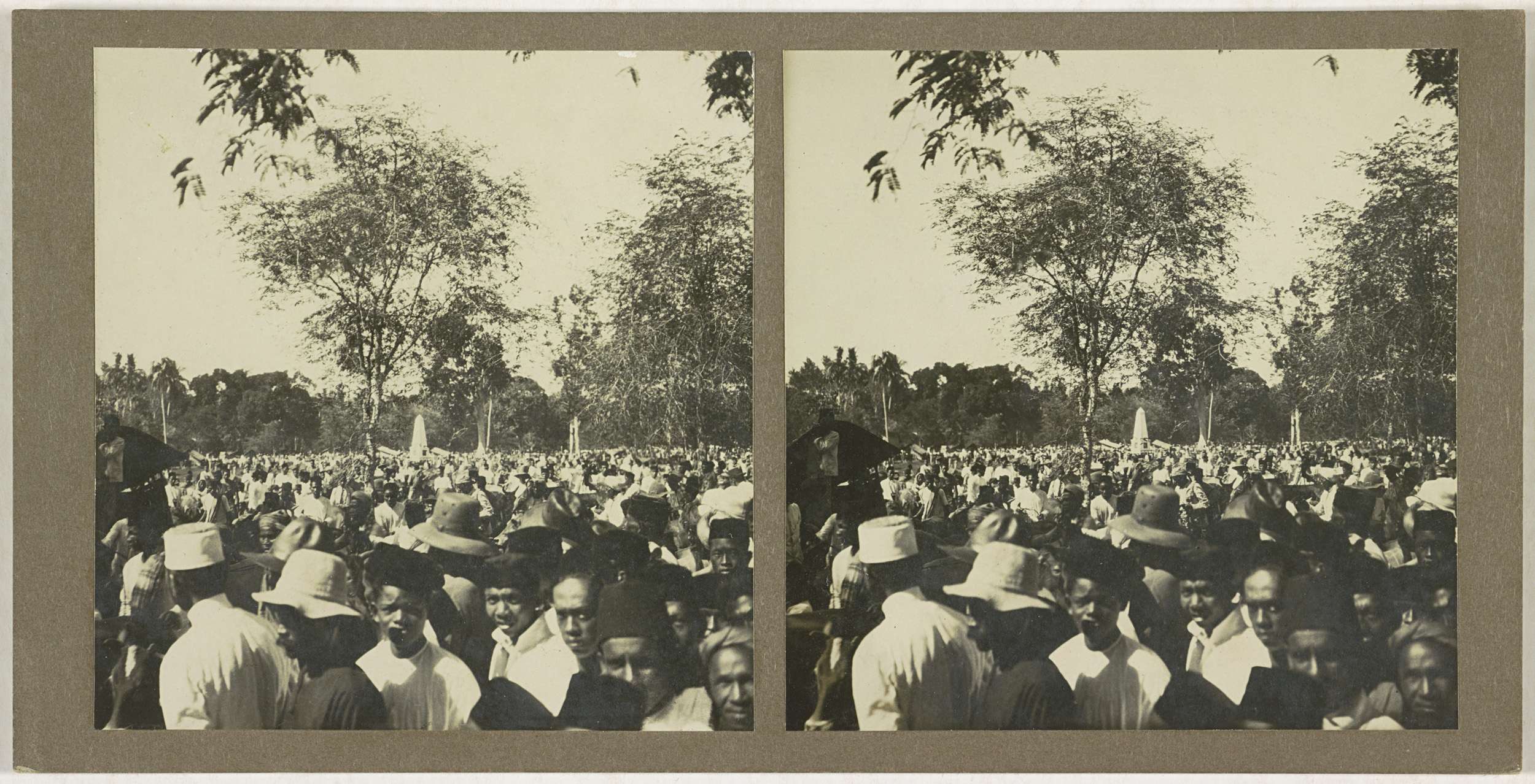 Menigte mensen op een plein, mogelijk op Borneo, Ind...