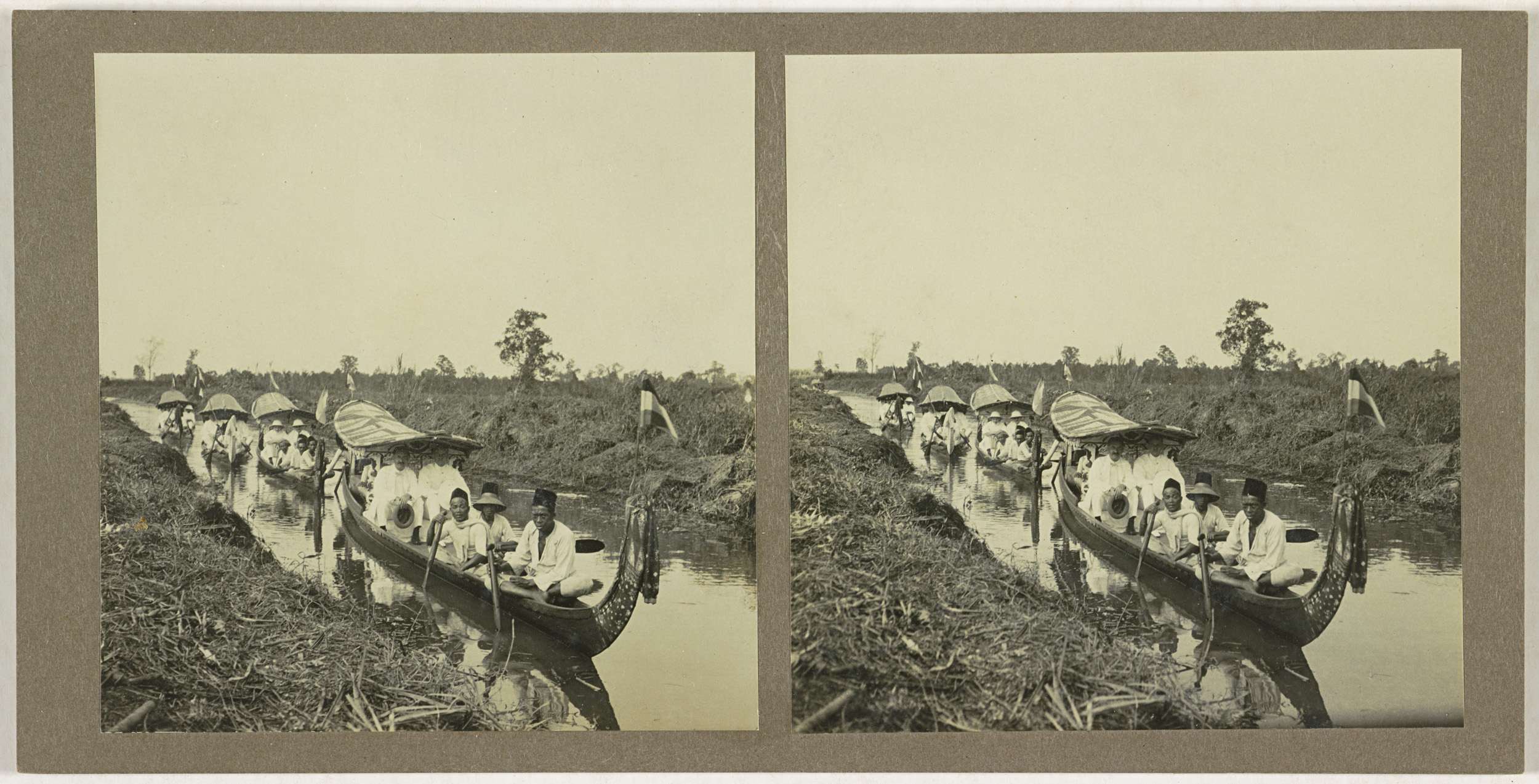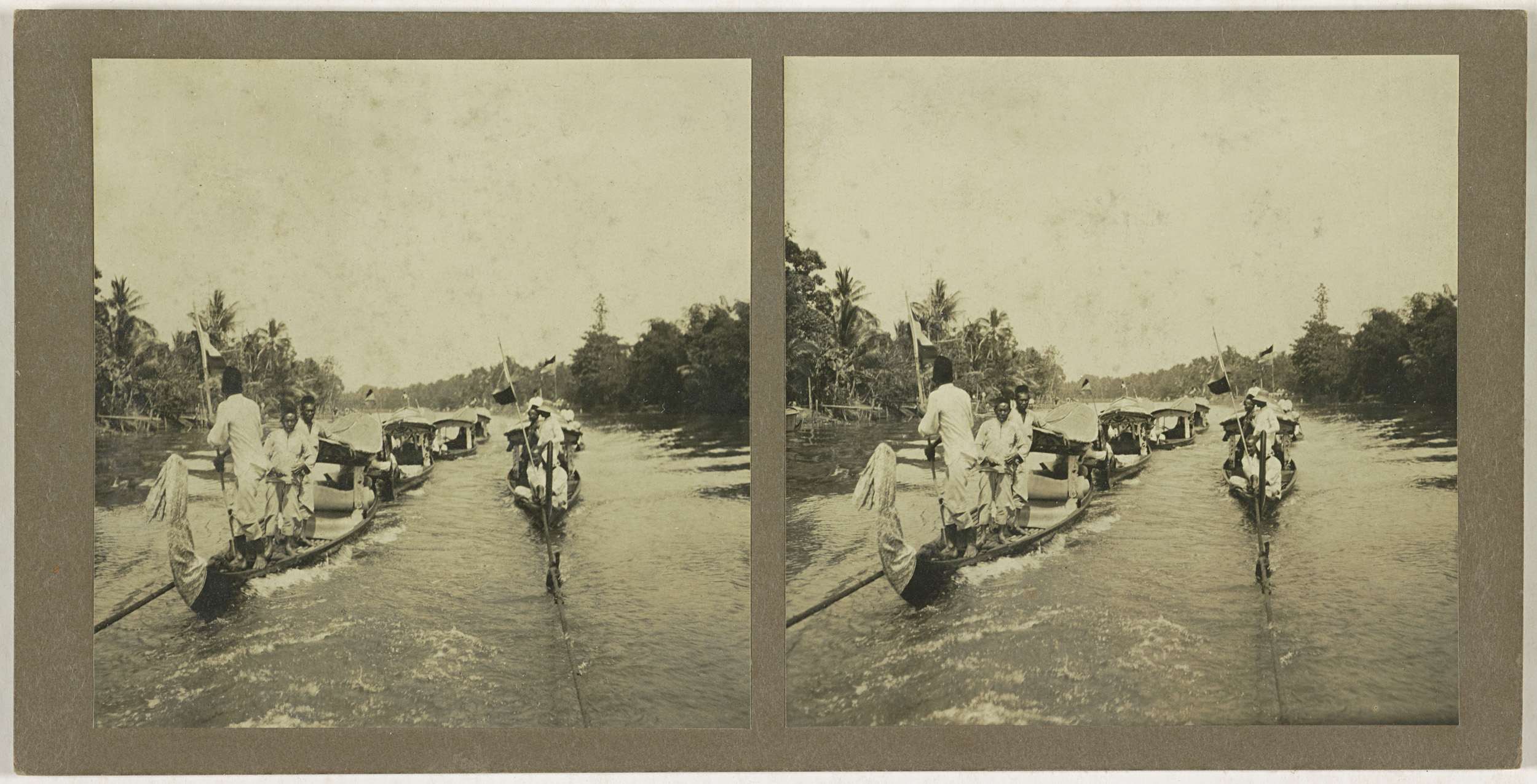 Enkele boten op smalle vaart, vermoedelijk de Sungai...