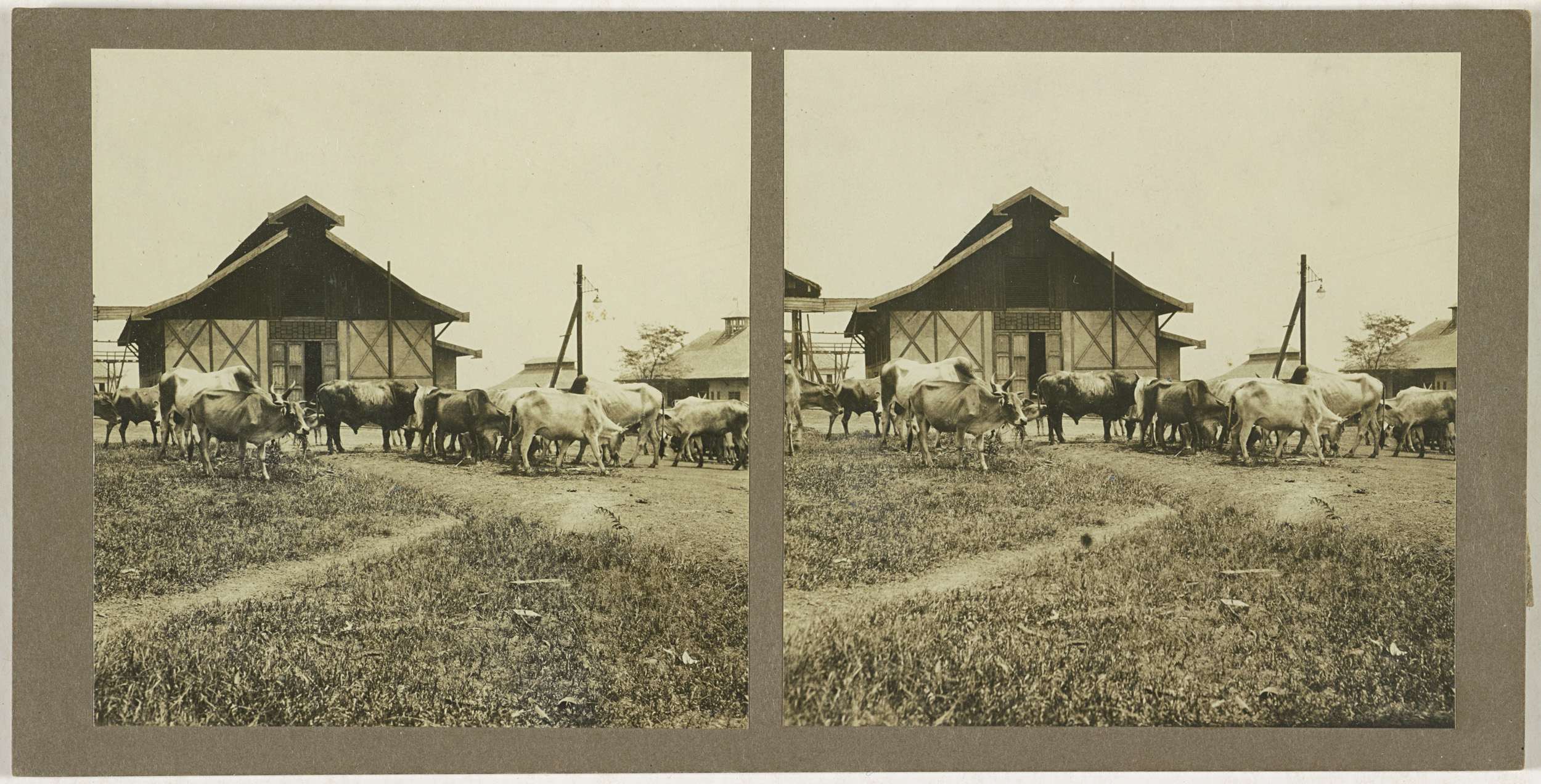 Loslopende koeien op een erf, mogelijk op Borneo, In...