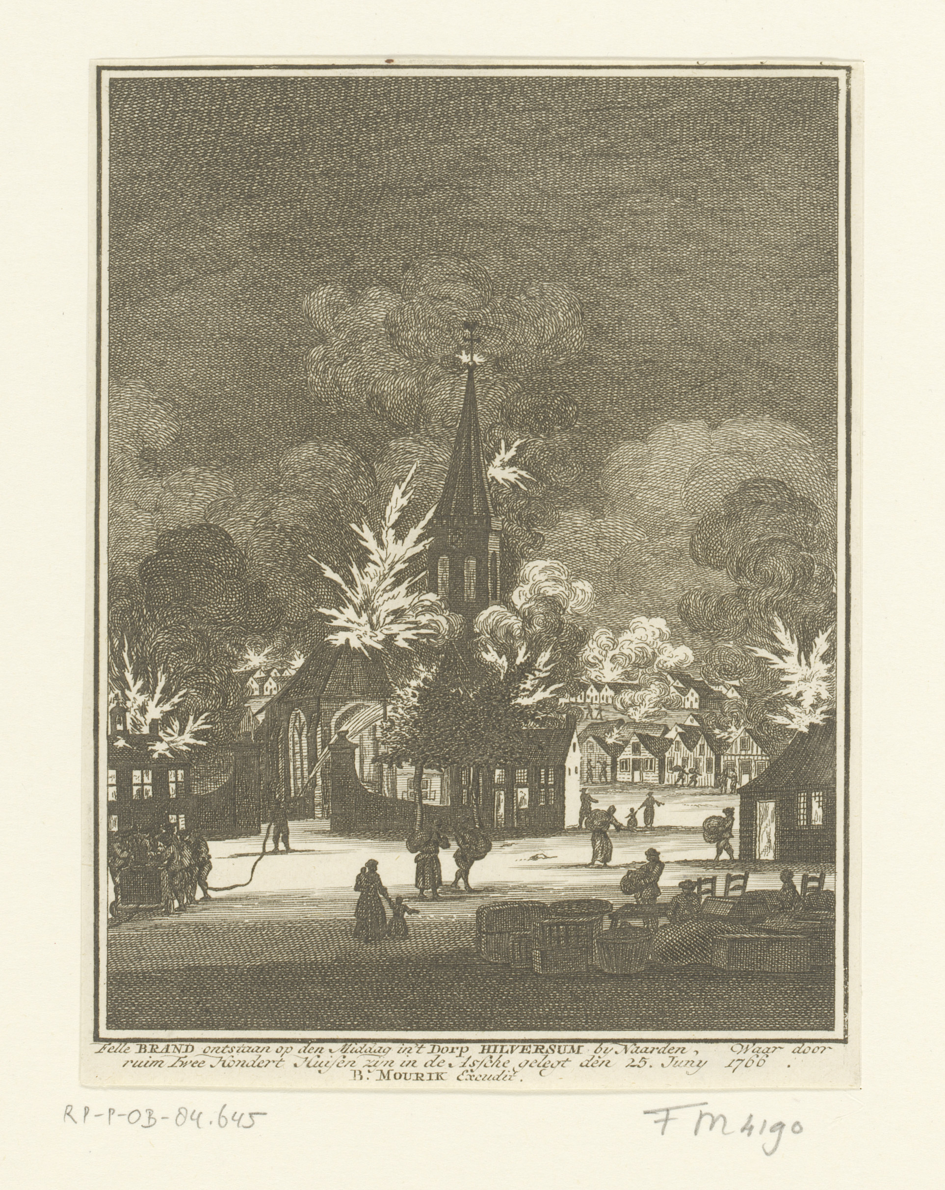 Blad met 12 vignetten en 4 platen van de brand in de...