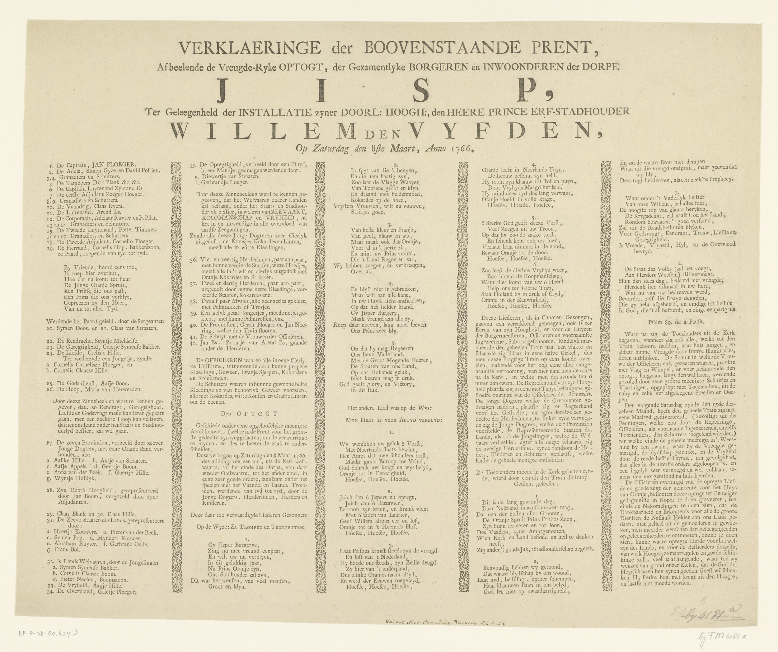 Tekstblad bij de prent van de optocht te Jisp bij de...