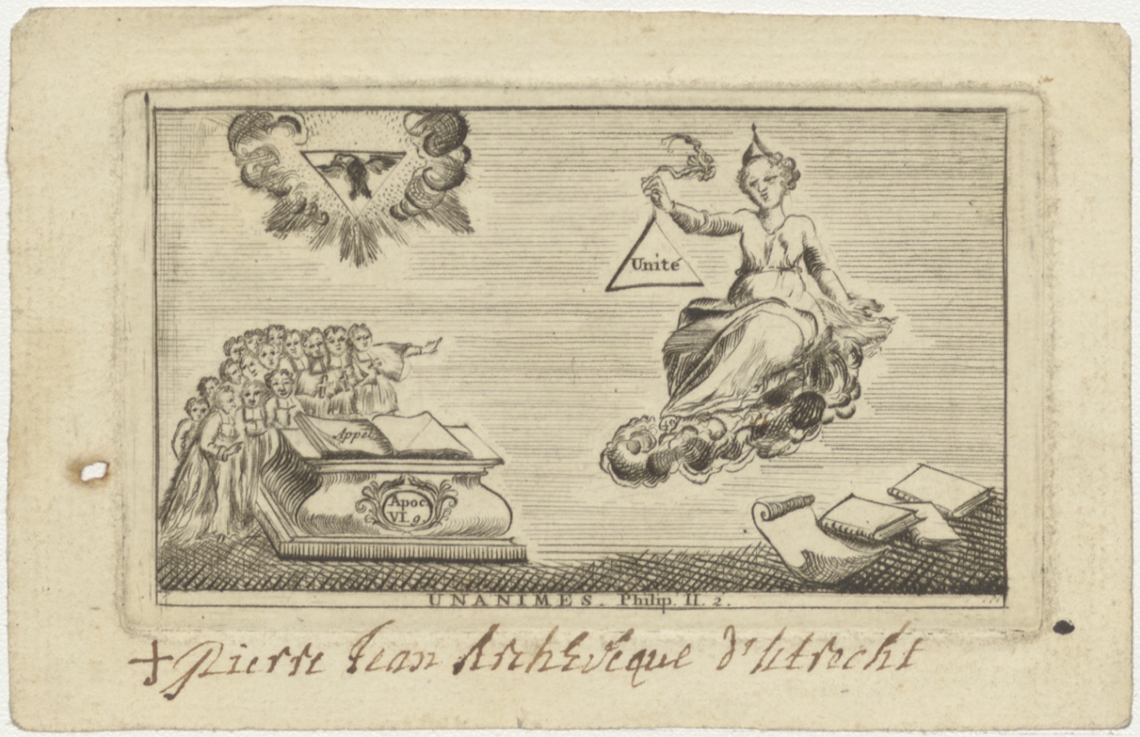 Christus(?) op wolk met schild unite, beneden priest...