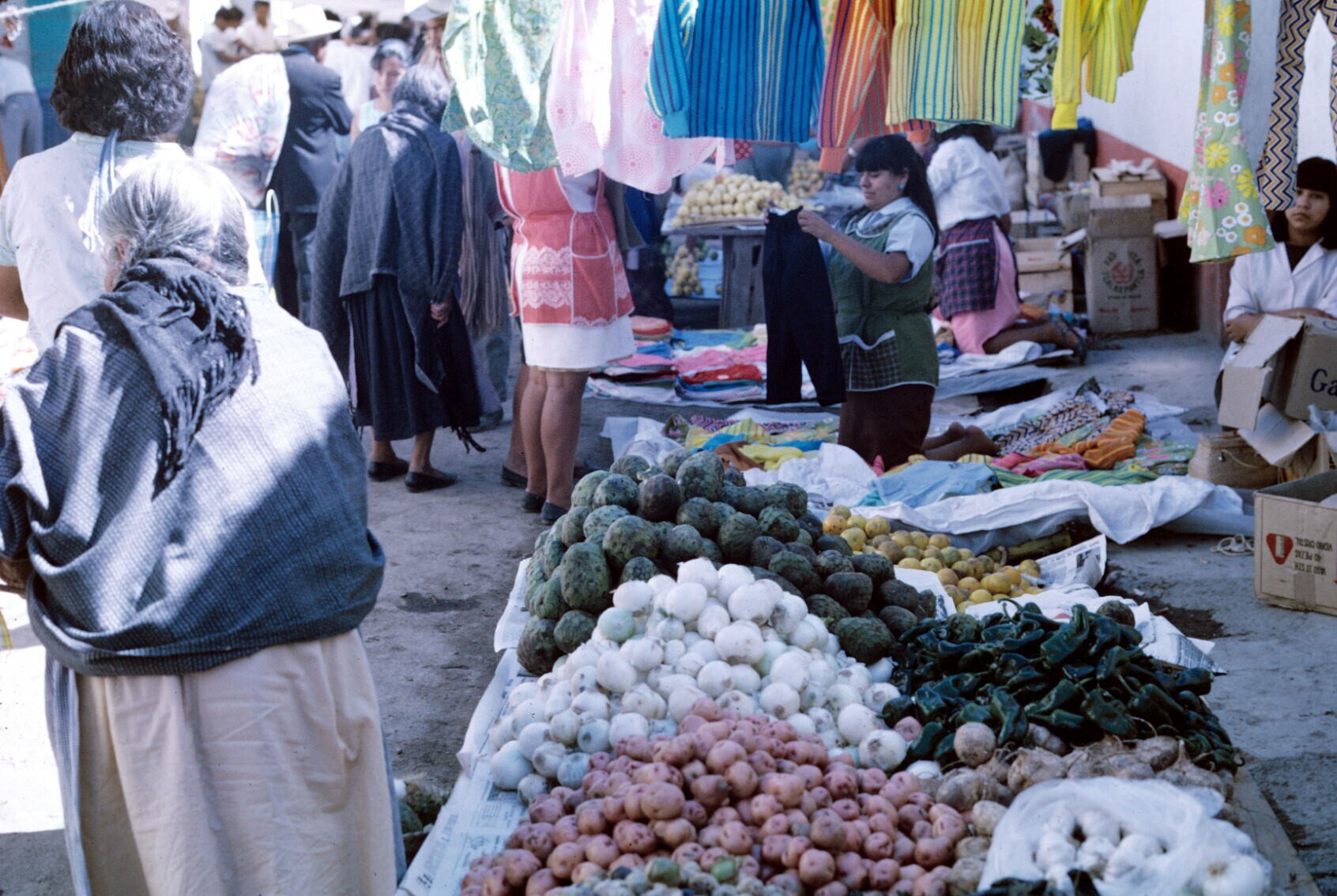 chiles (Spaanse pepers), knoflook en fruit op markt