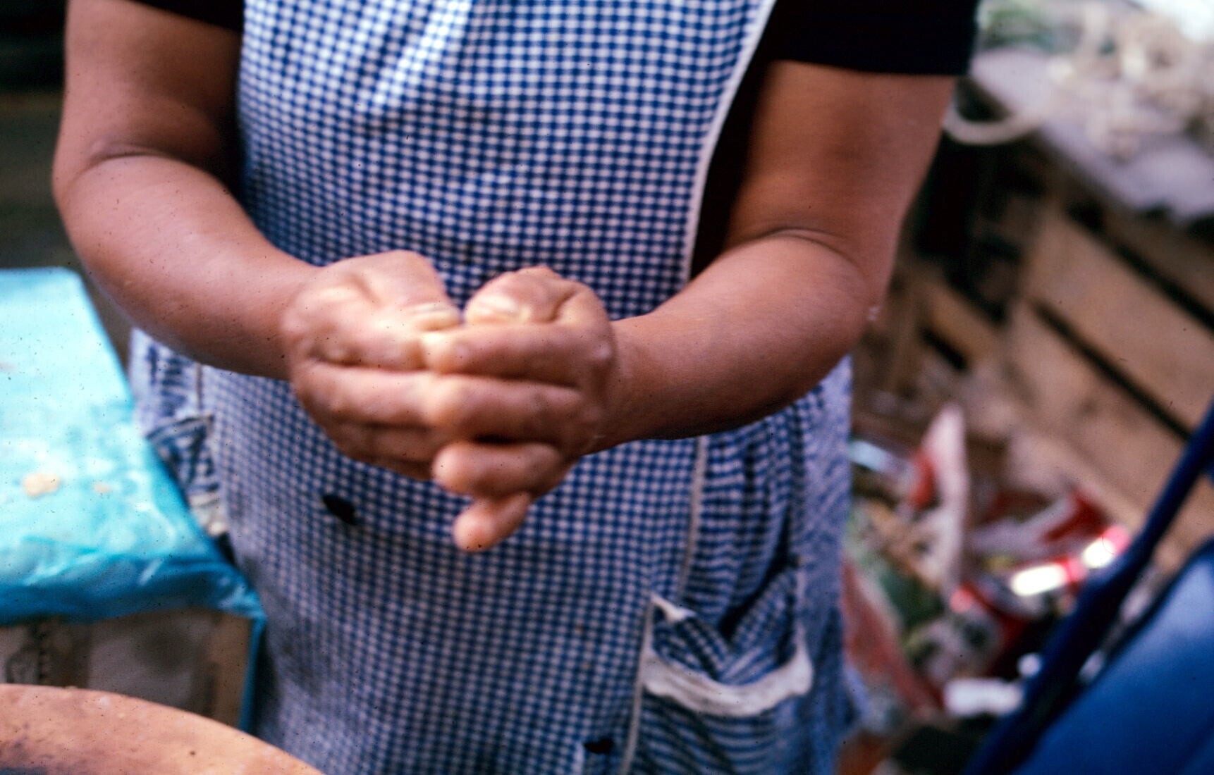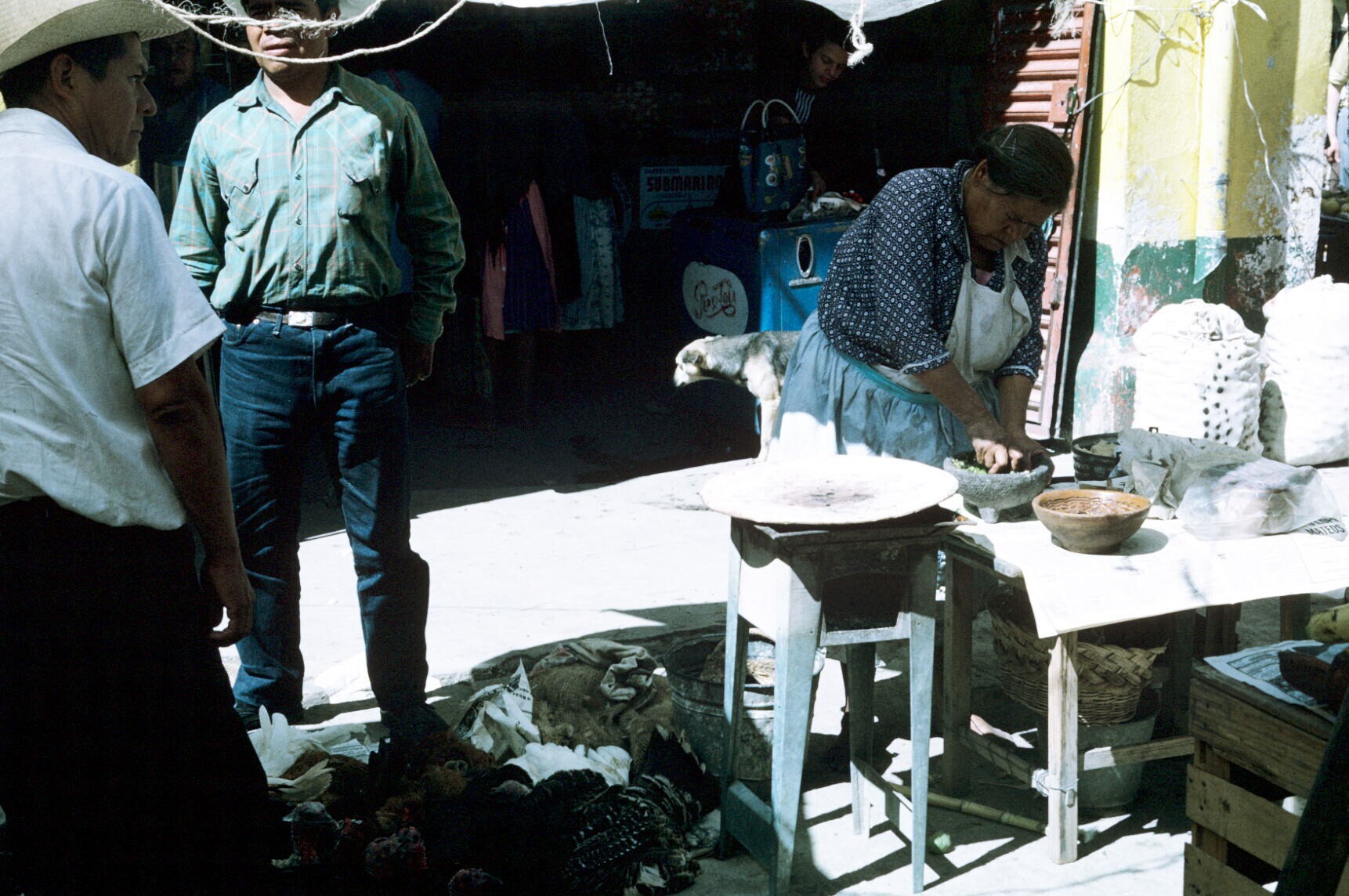 tortillaverkoopster, mole (saus) makend, op markt