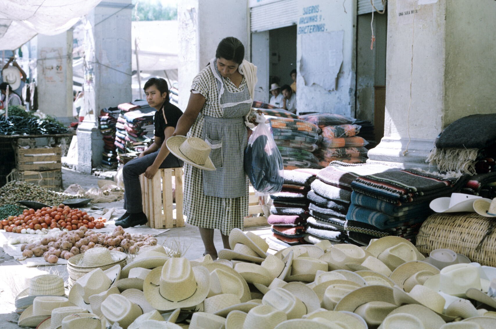 tortillaverkoopster in stalletje, met tortilladera (...