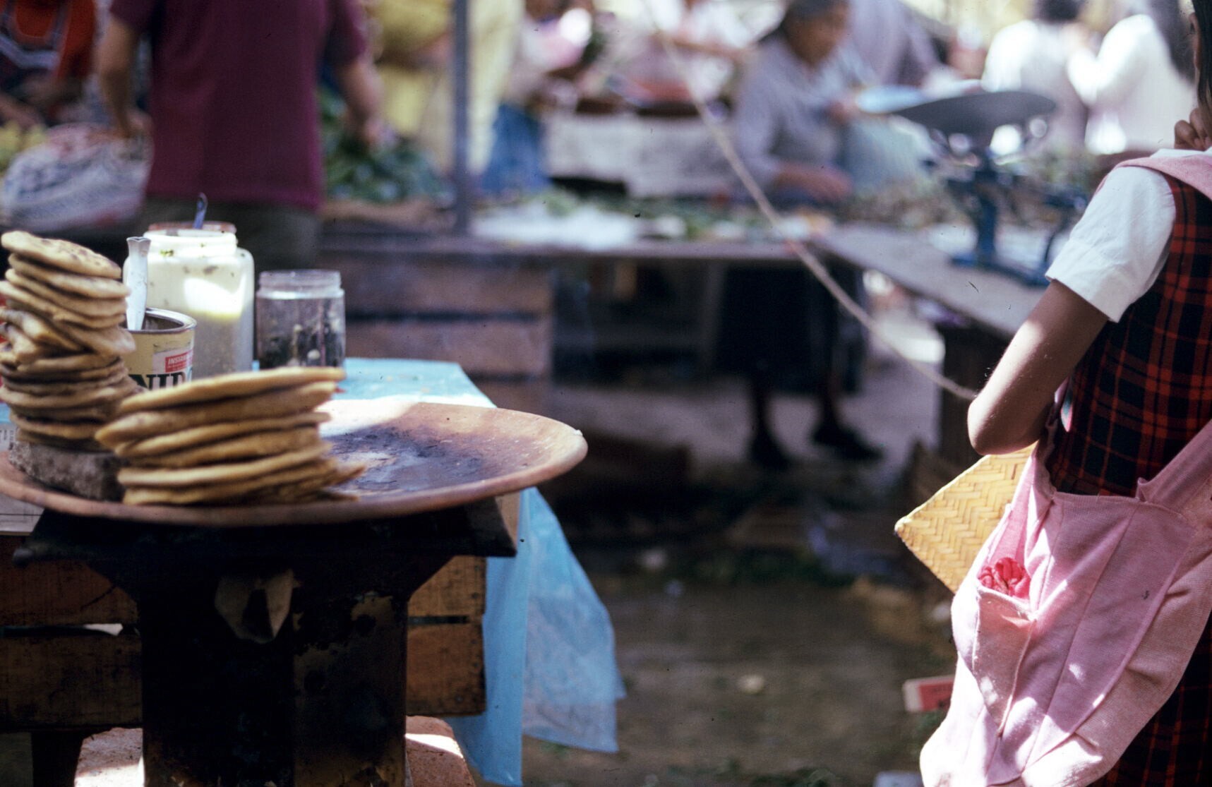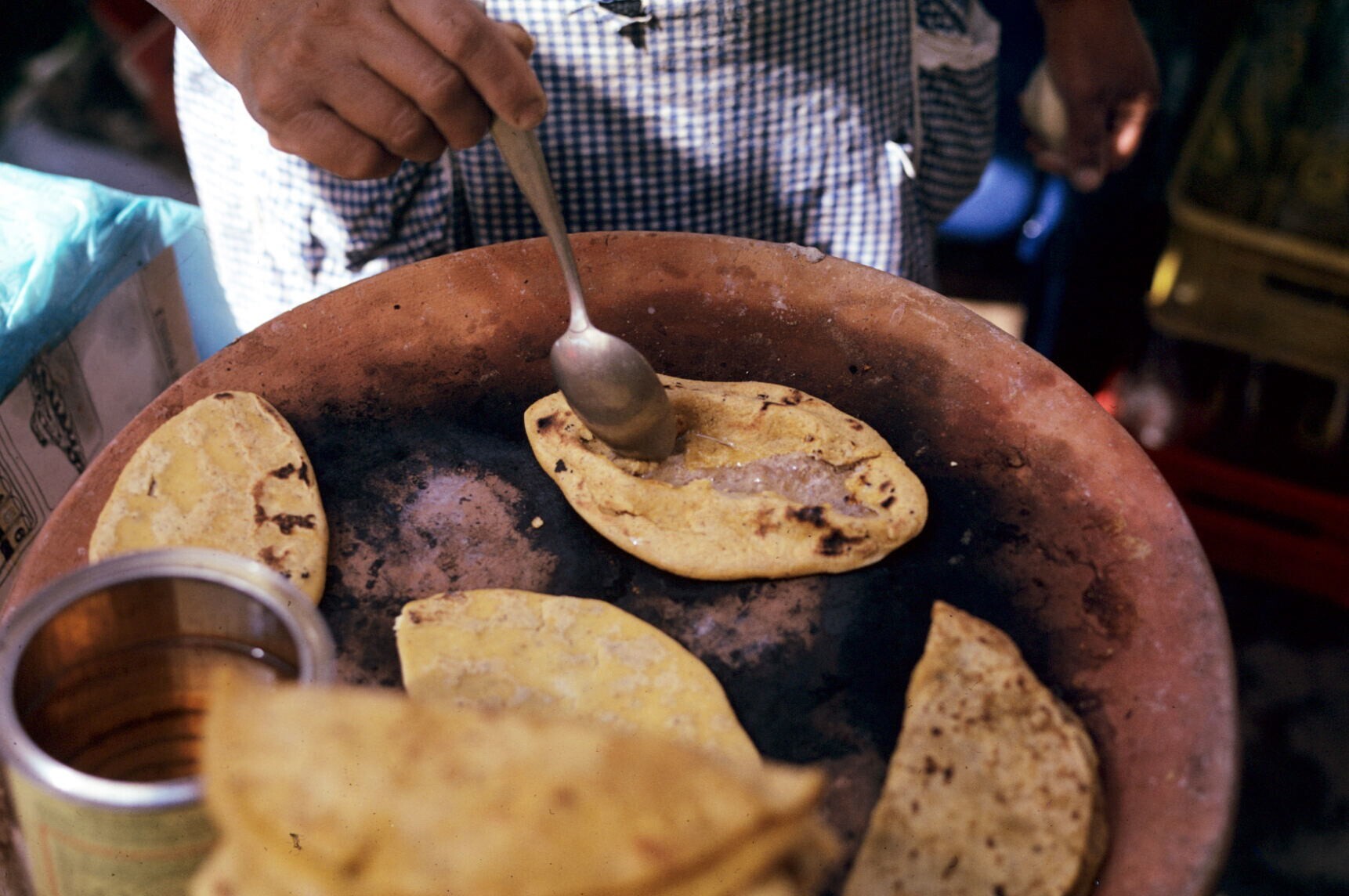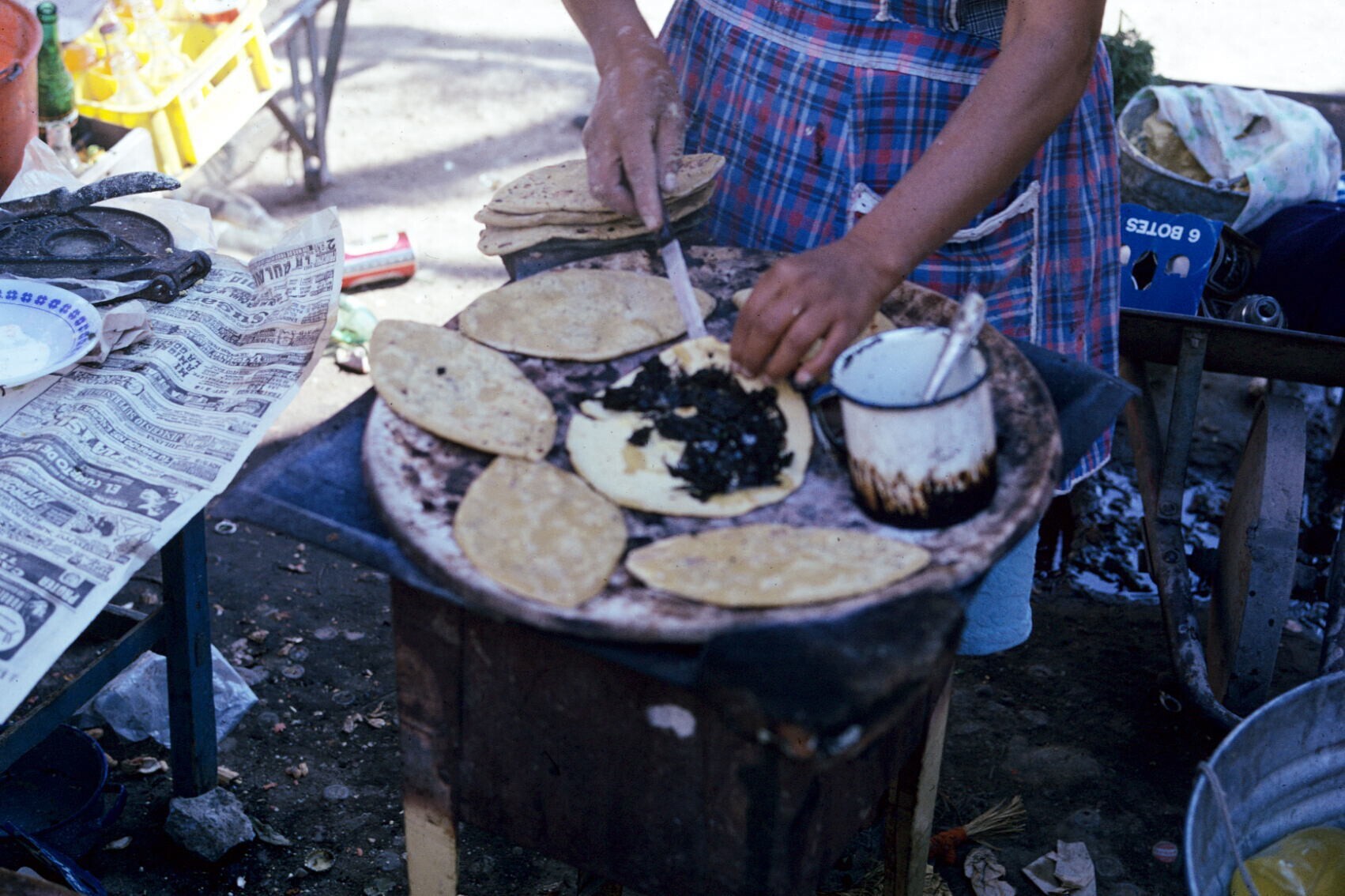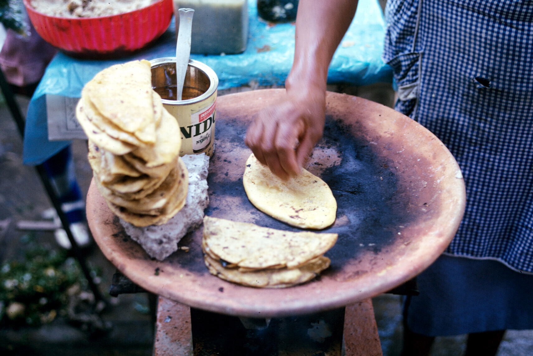 tortillaverkoopster in stalletje, met comal (bakplaat)