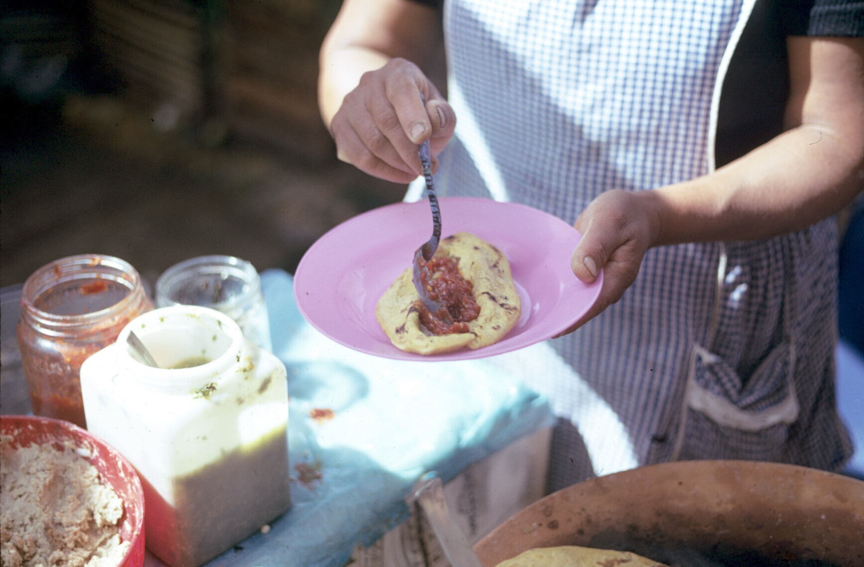 tortillaverkoopster doet mole (saus) op tortilla's