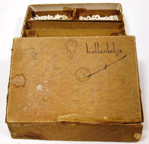 Doos van karton met plastic plakletters en -cijfers ...