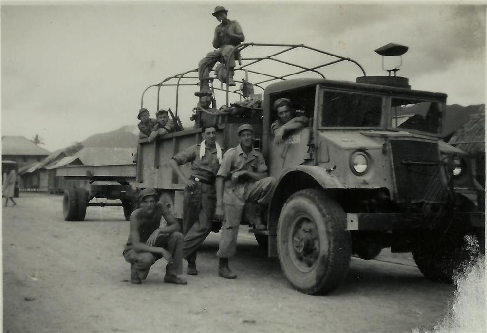 Indië na WO 2; Sumatra, geparkeerde militaire voertu...