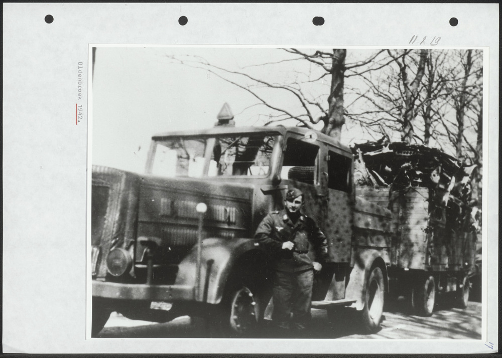 Foto Duitse militair met vrachtwagen in camouflagekl...