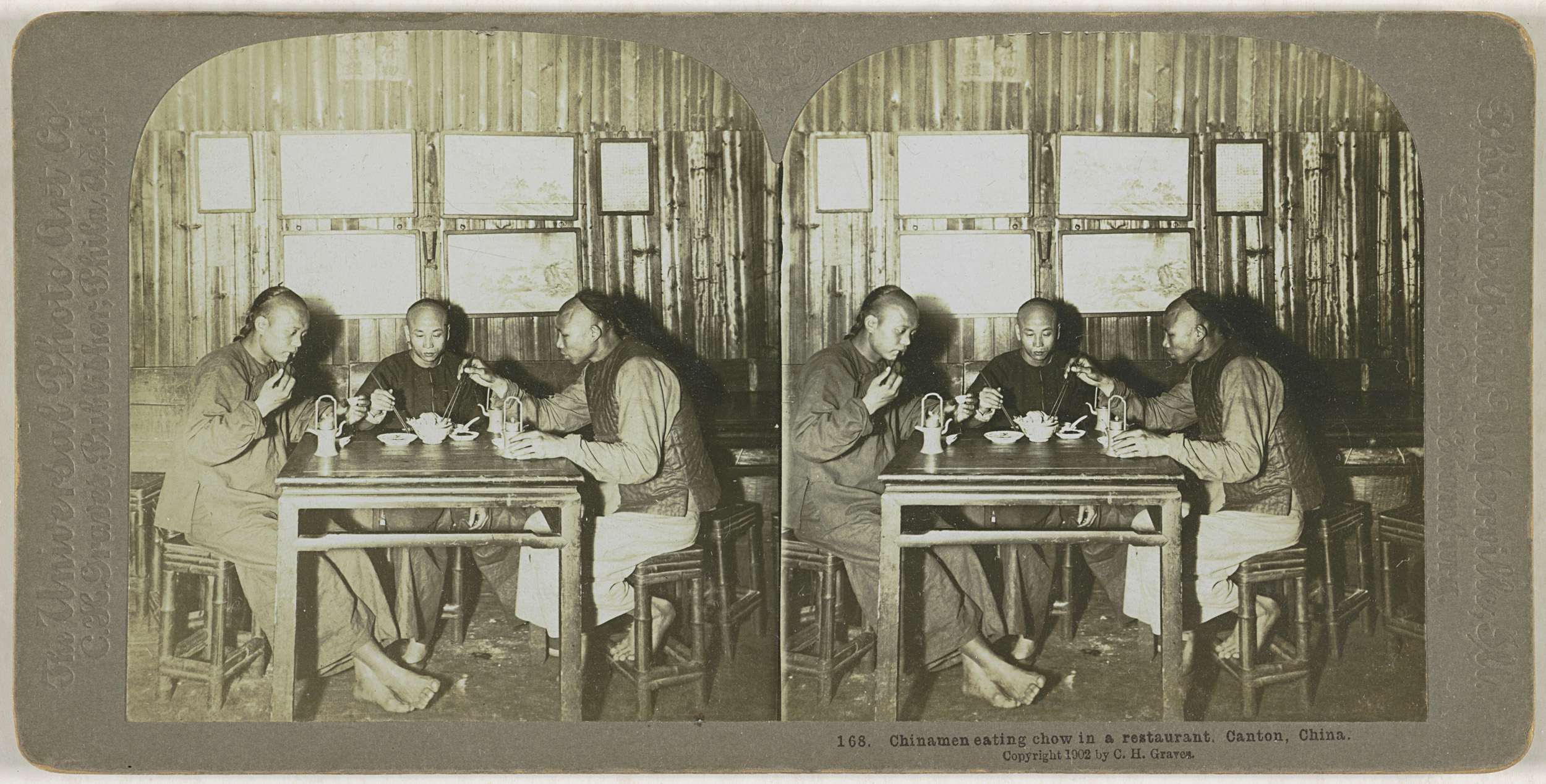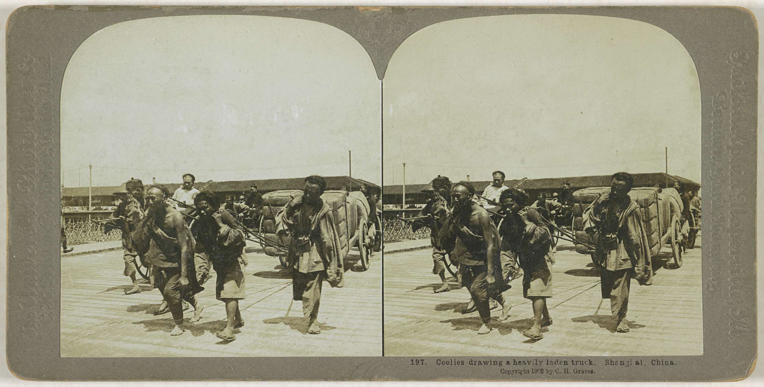 Vier mannen trekken een zwaar beladen kar, Shanghai