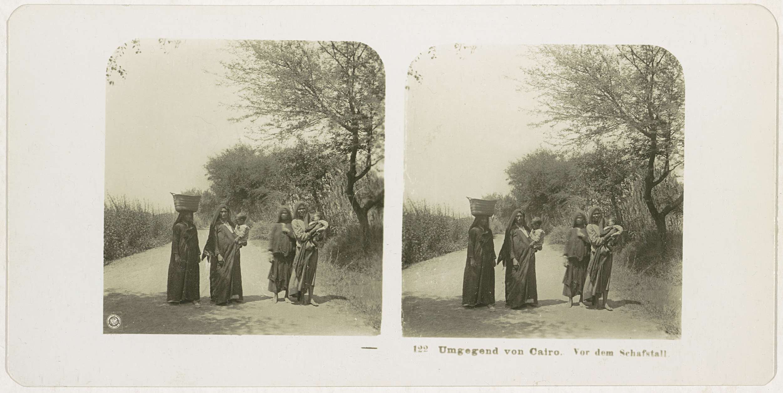Vier vrouwen met twee kinderen op een landweg nabij ...
