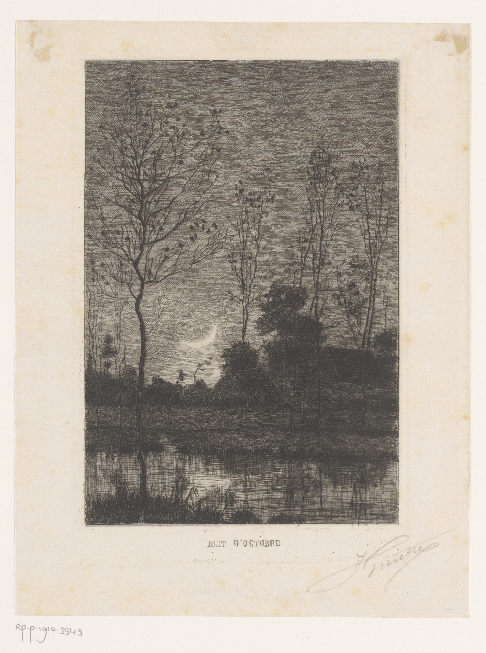 Nachtelijk herfstlandschap met een boerderij aan een...