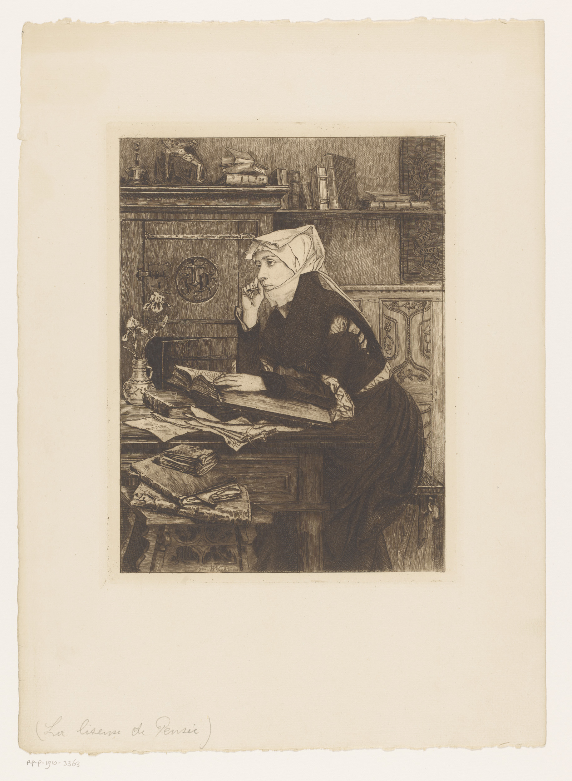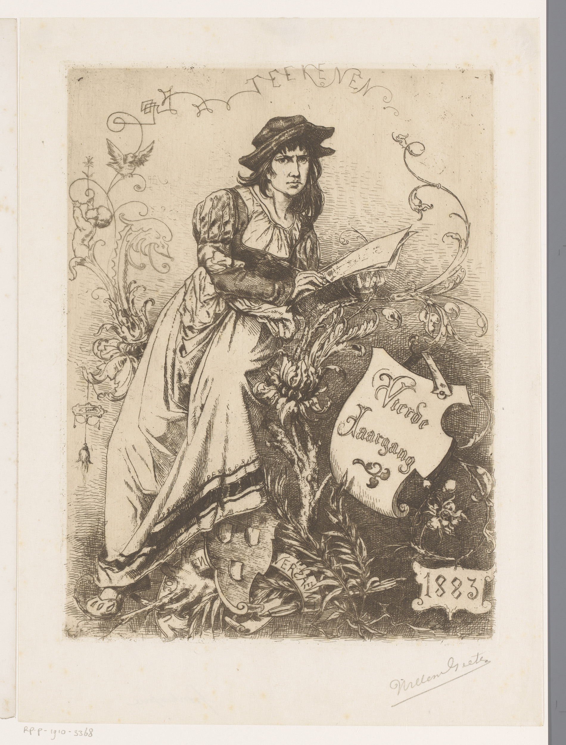 Jonge vrouw aan het tekenen, leunend op florale ranken
