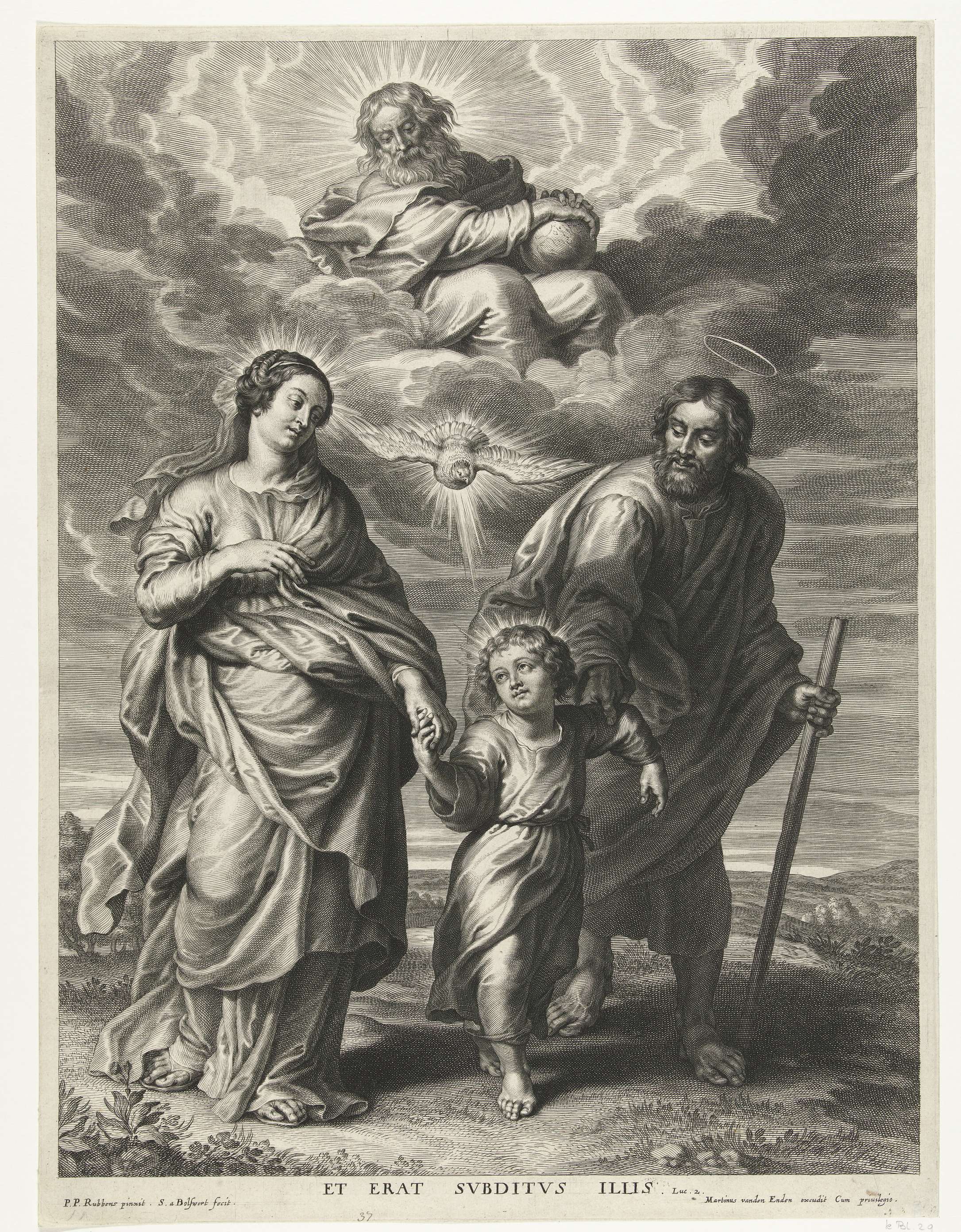 Christuskind loopt tussen Maria en Jozef met boven h...
