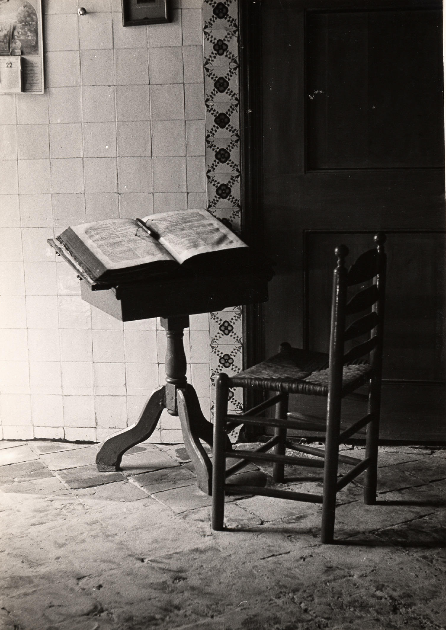 Lessenaar met bijbel in interieur, Staphorst, 1950 (...