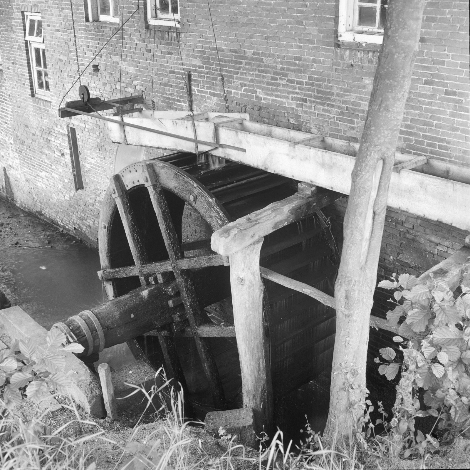 Rad van watergedreven bovenslagmolen in vervallen staat