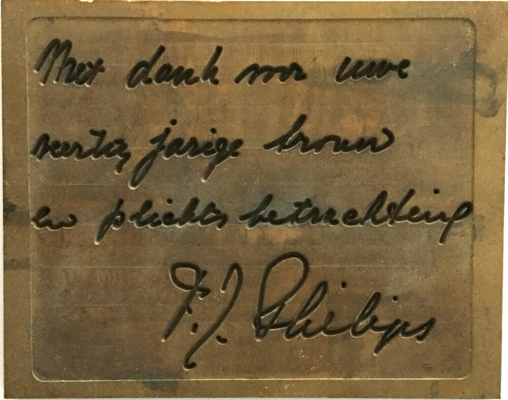 bronzen mal met tekst: Met dank voor uwe veertig jar...