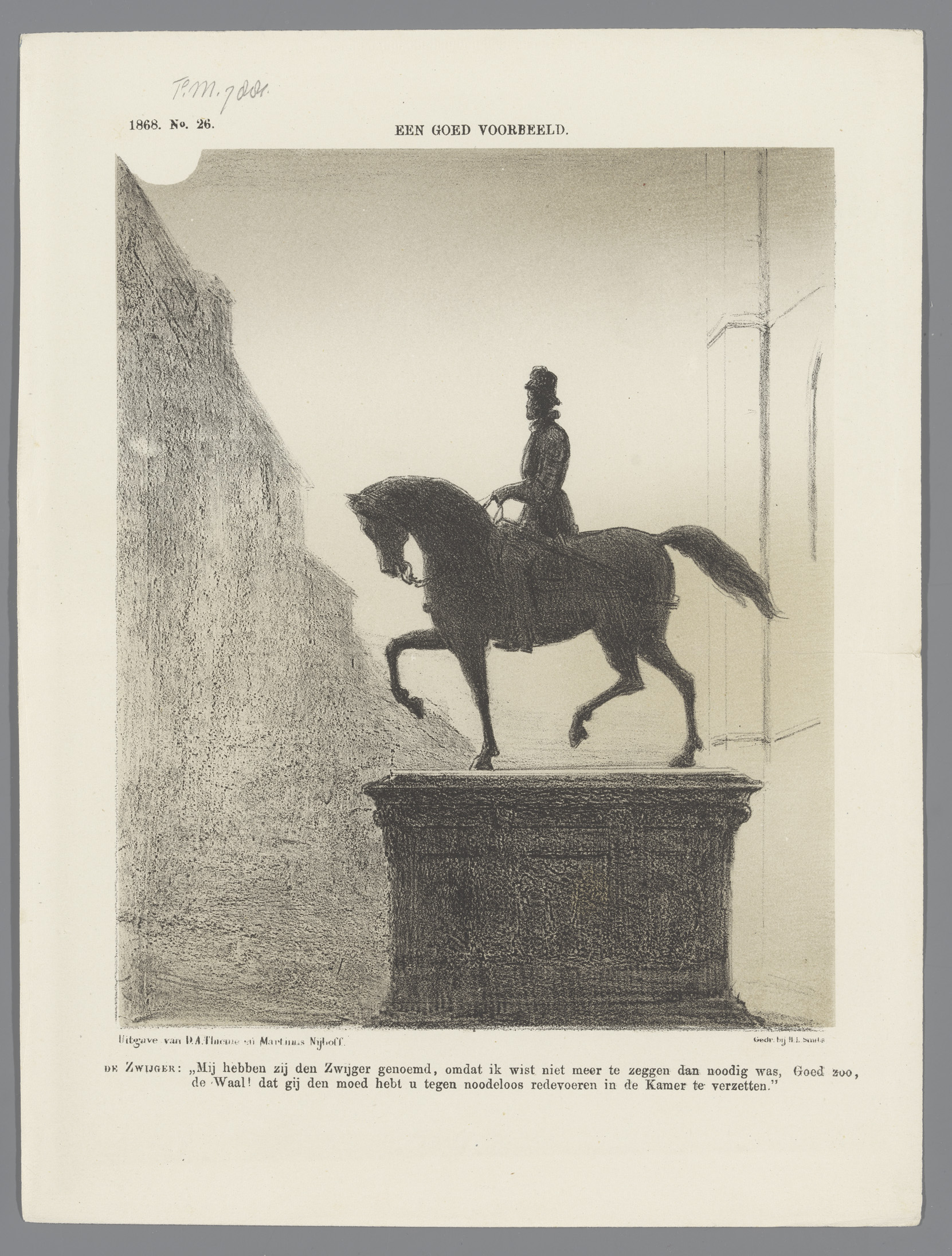 Spotprent met het ruiterstandbeeld van Willem de Zwi...