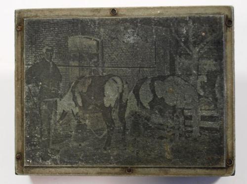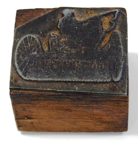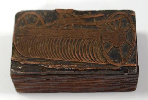 Stempel van hout en metaal vorstellend een sleephark...