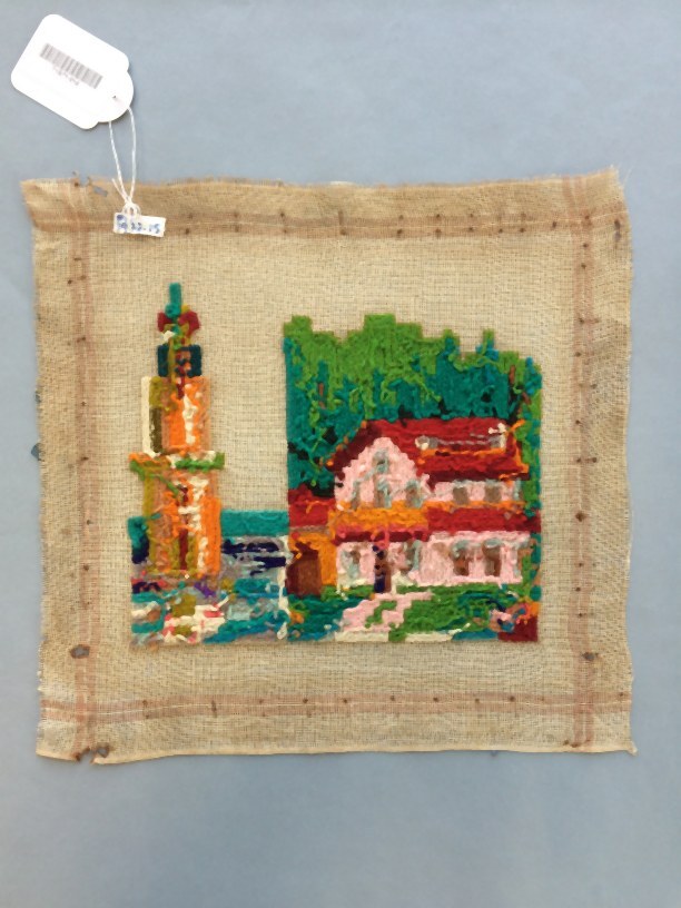 Borduurstuk op stramien van wol tapisserie, een land...