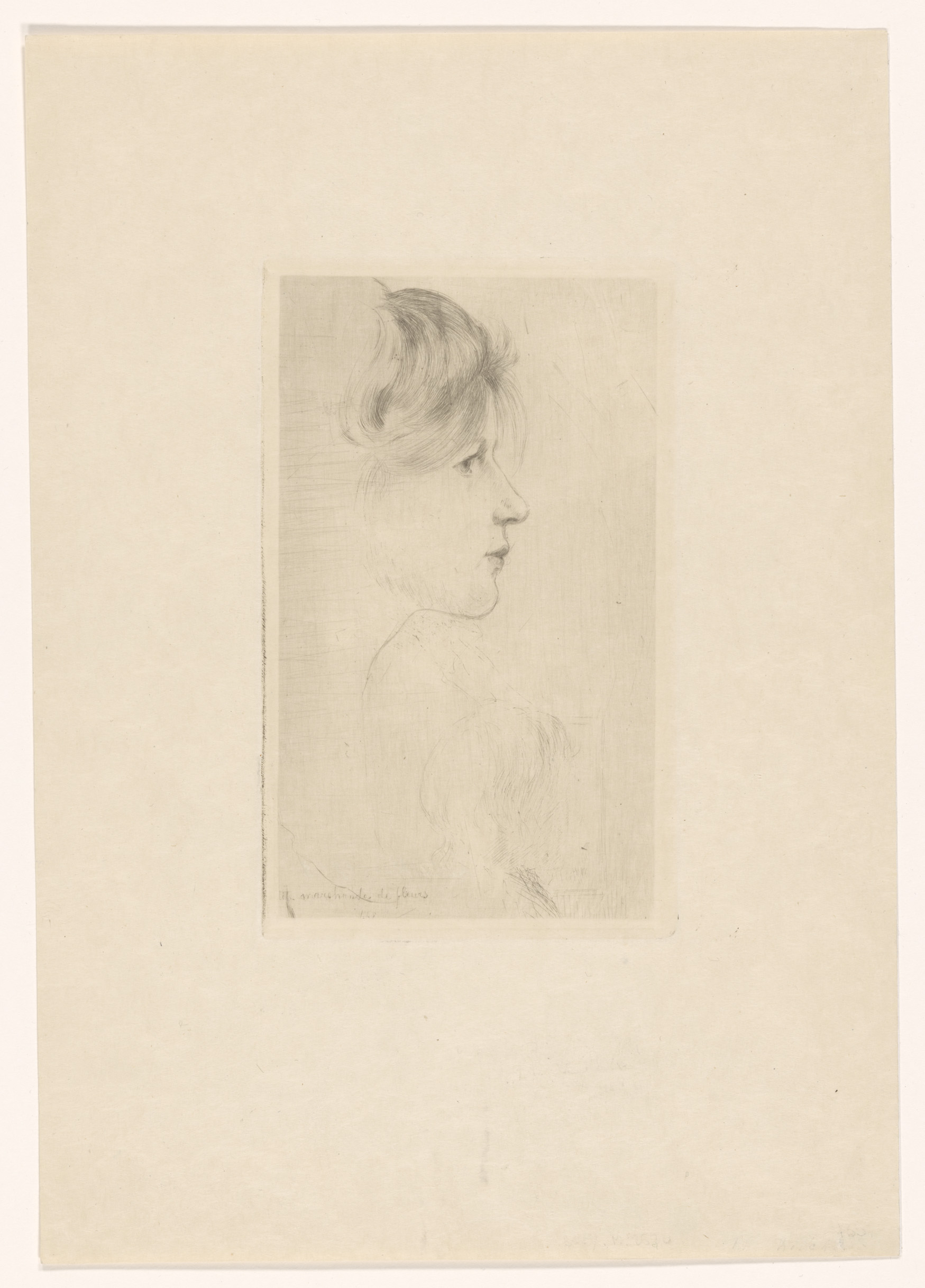 Gezicht van een bloemenverkoopster, en profil naar r...
