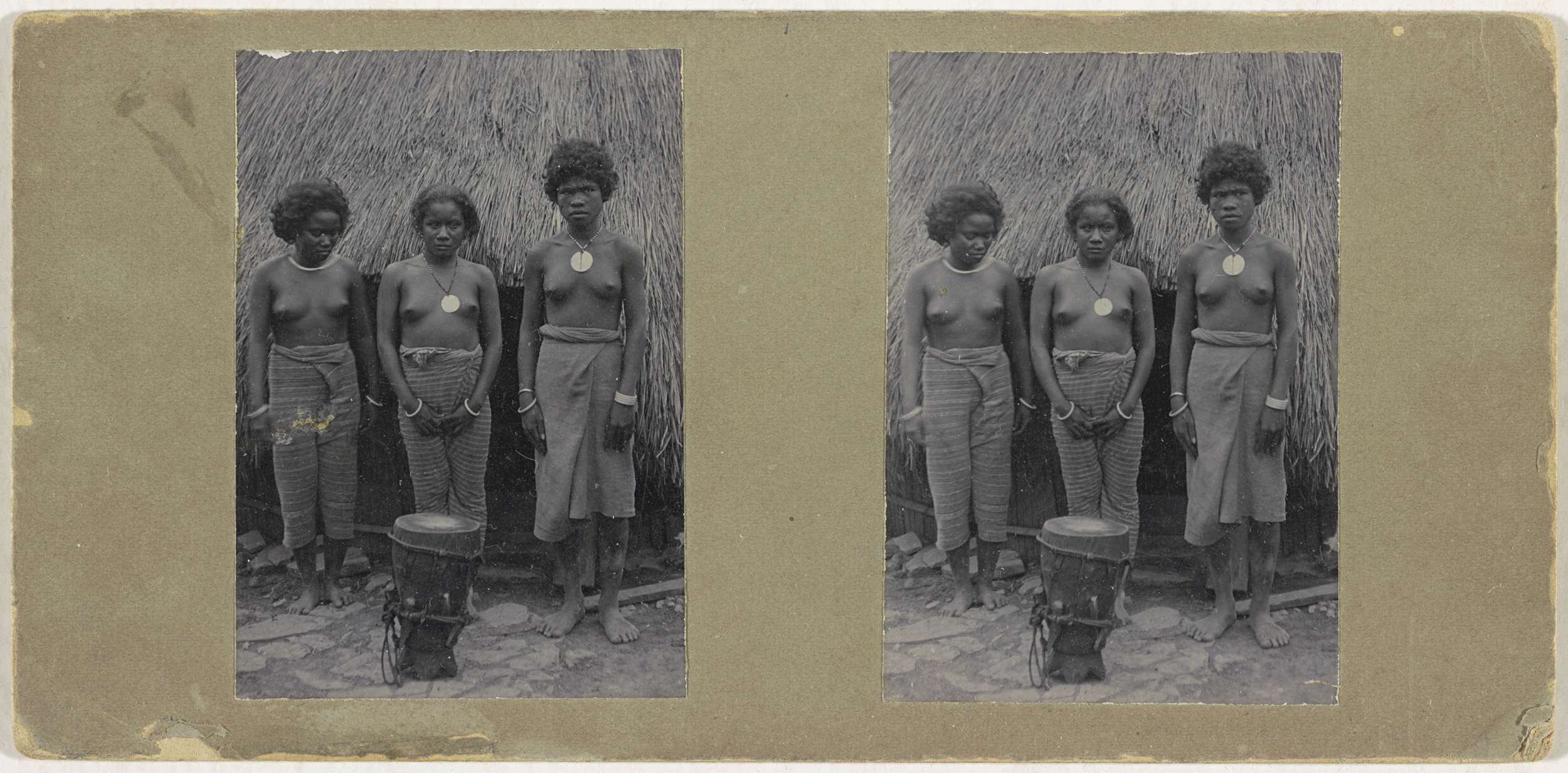 Drie vrouwen staan voor een rieten dak bij een trommel