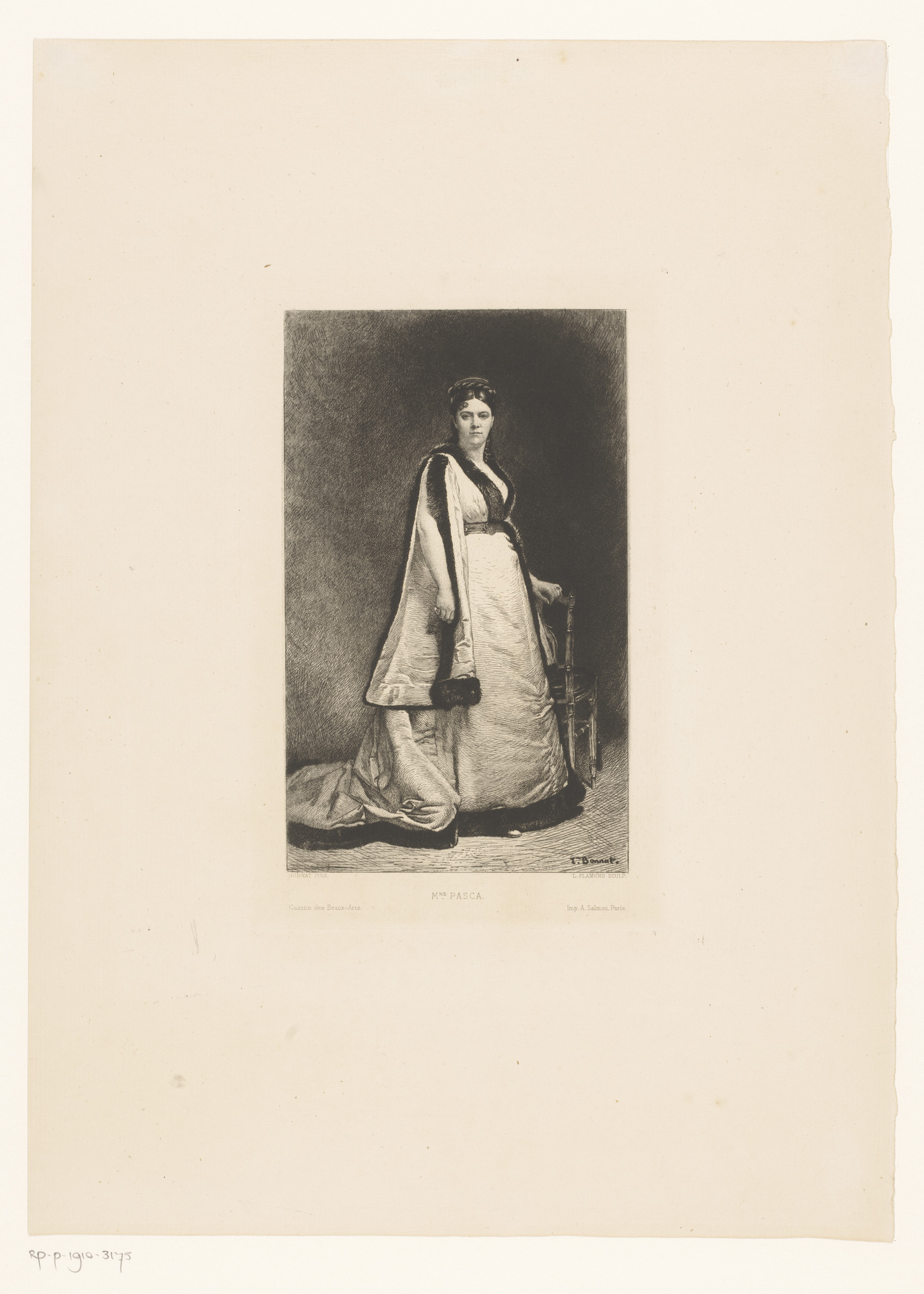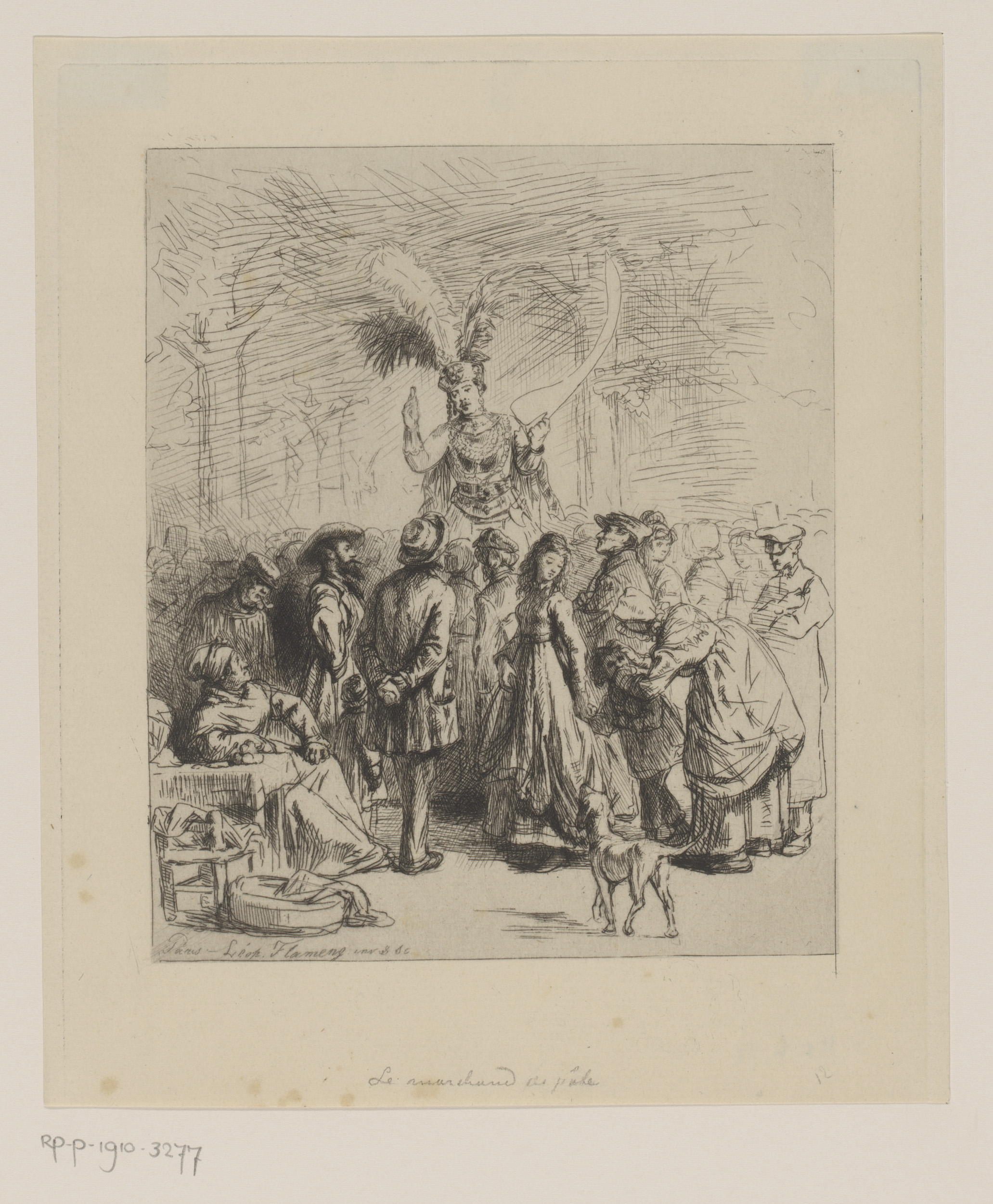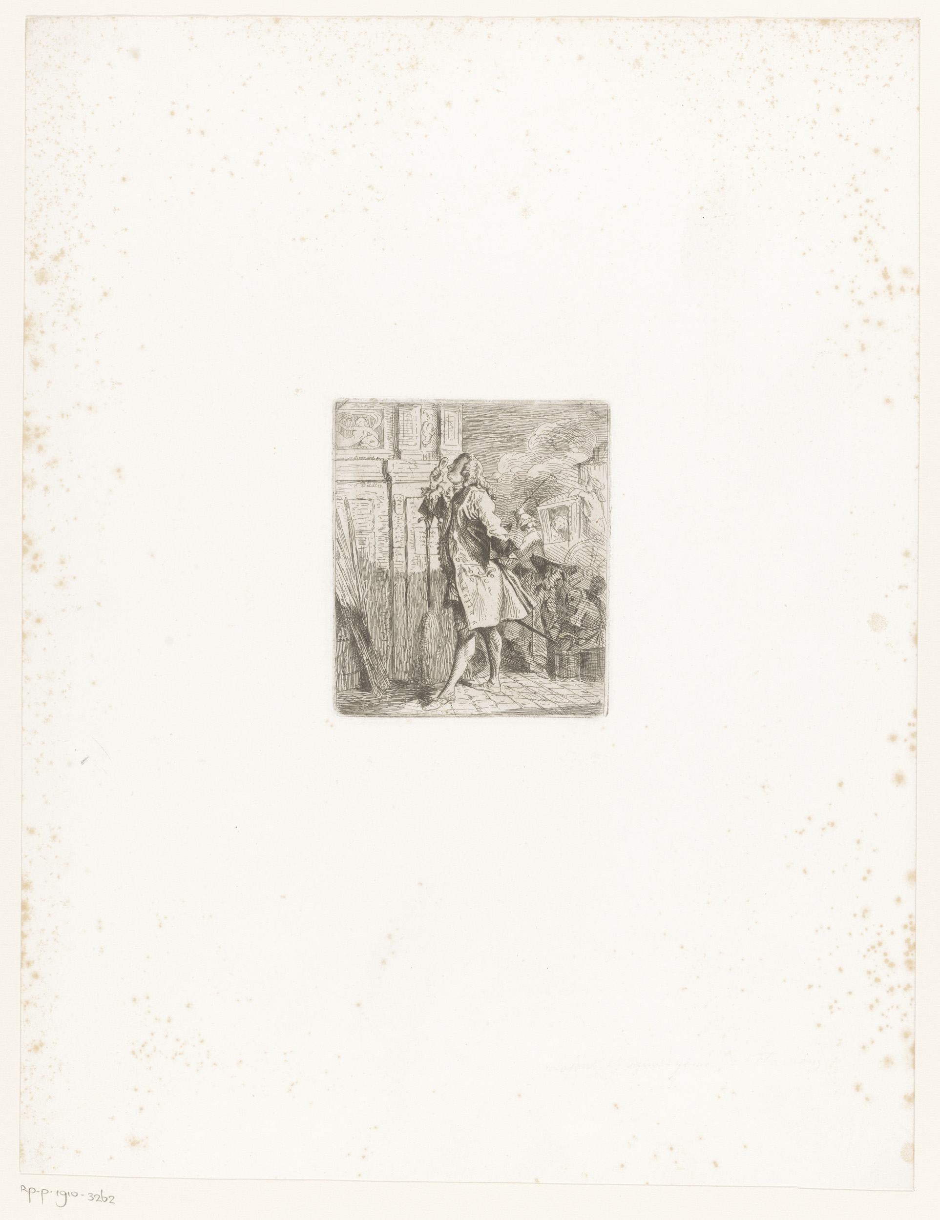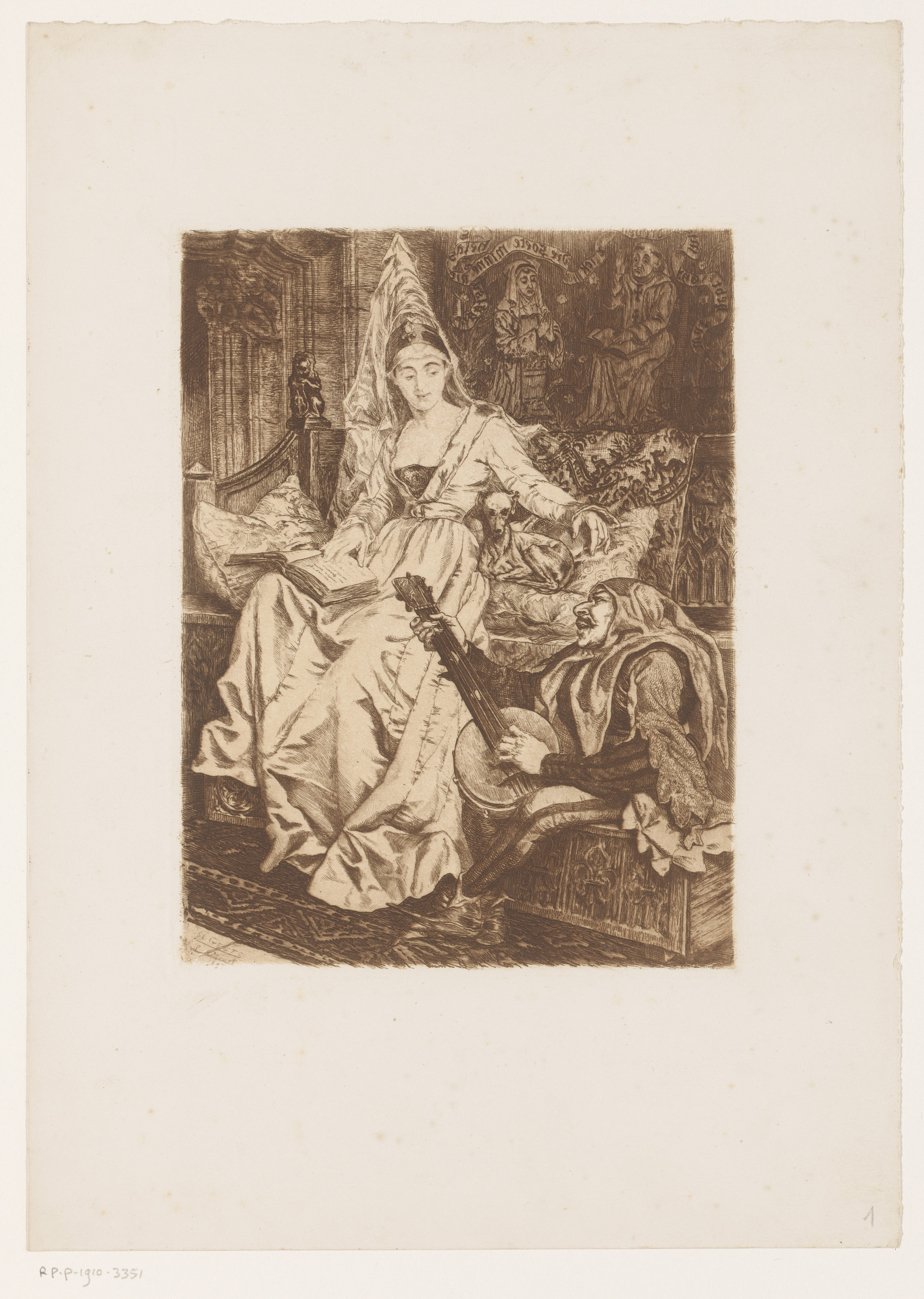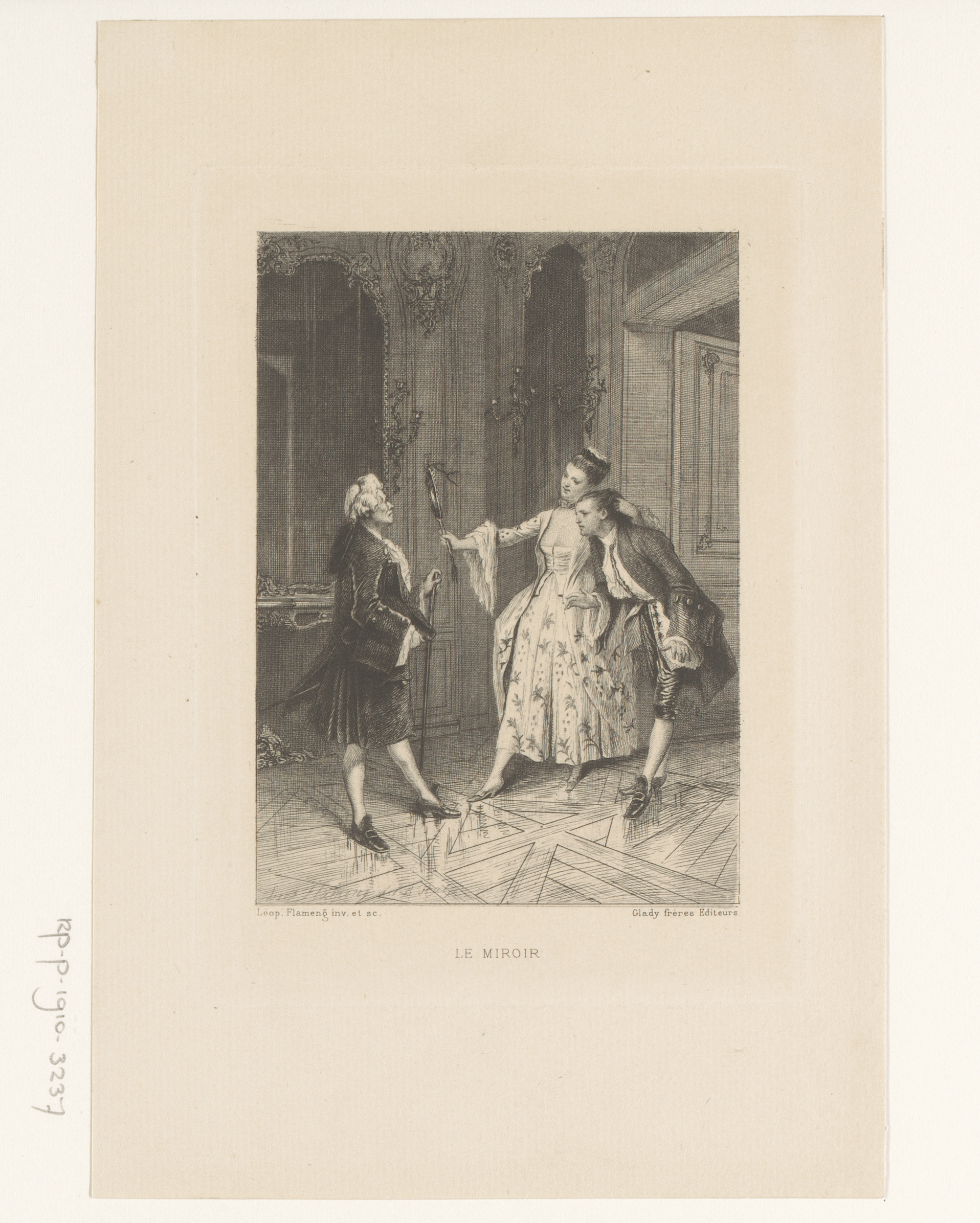 Manon Lescaut met een spiegel in de hand en twee mannen