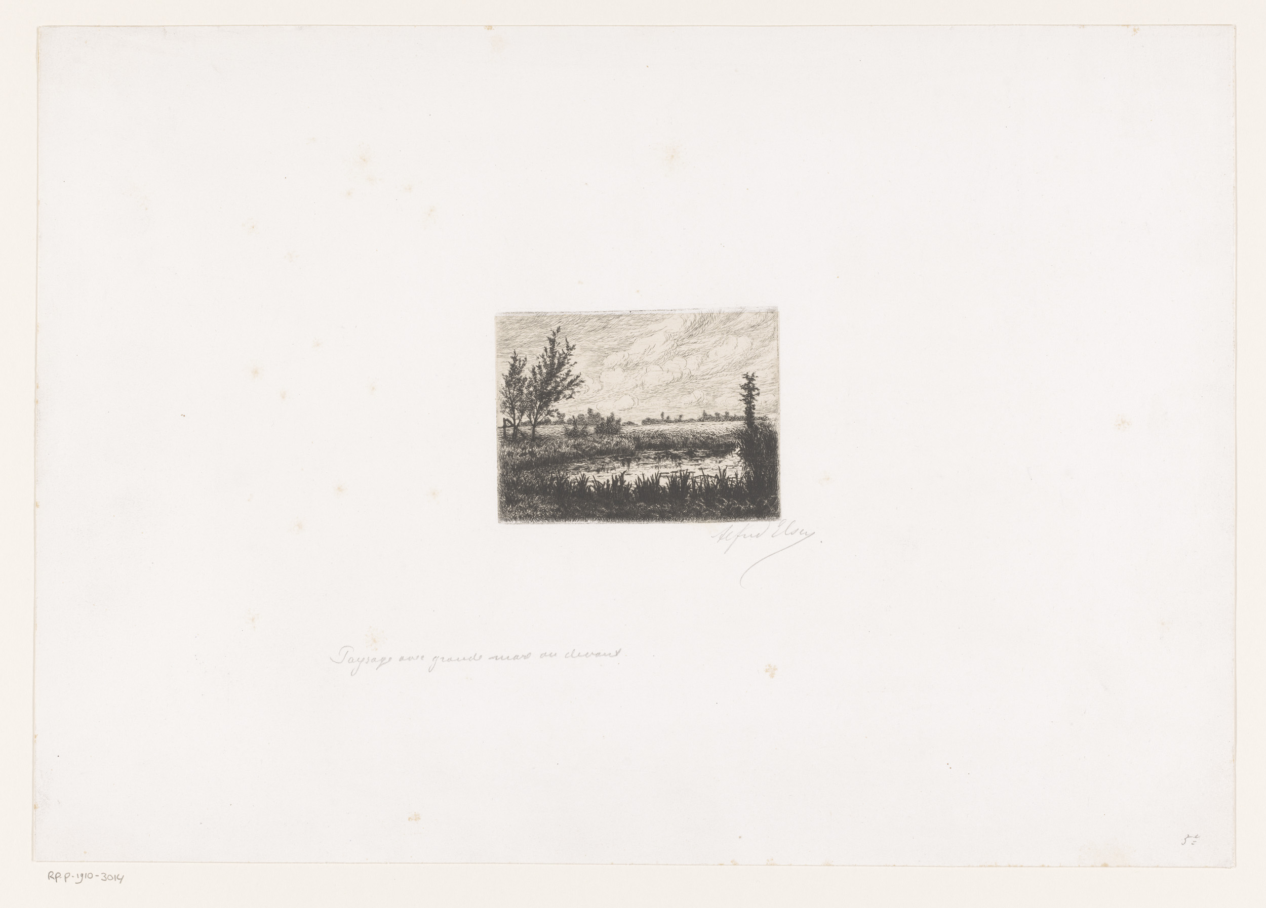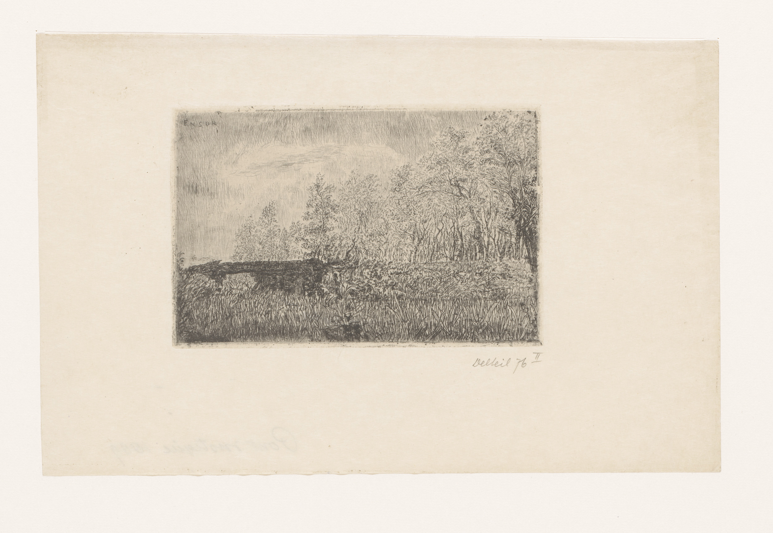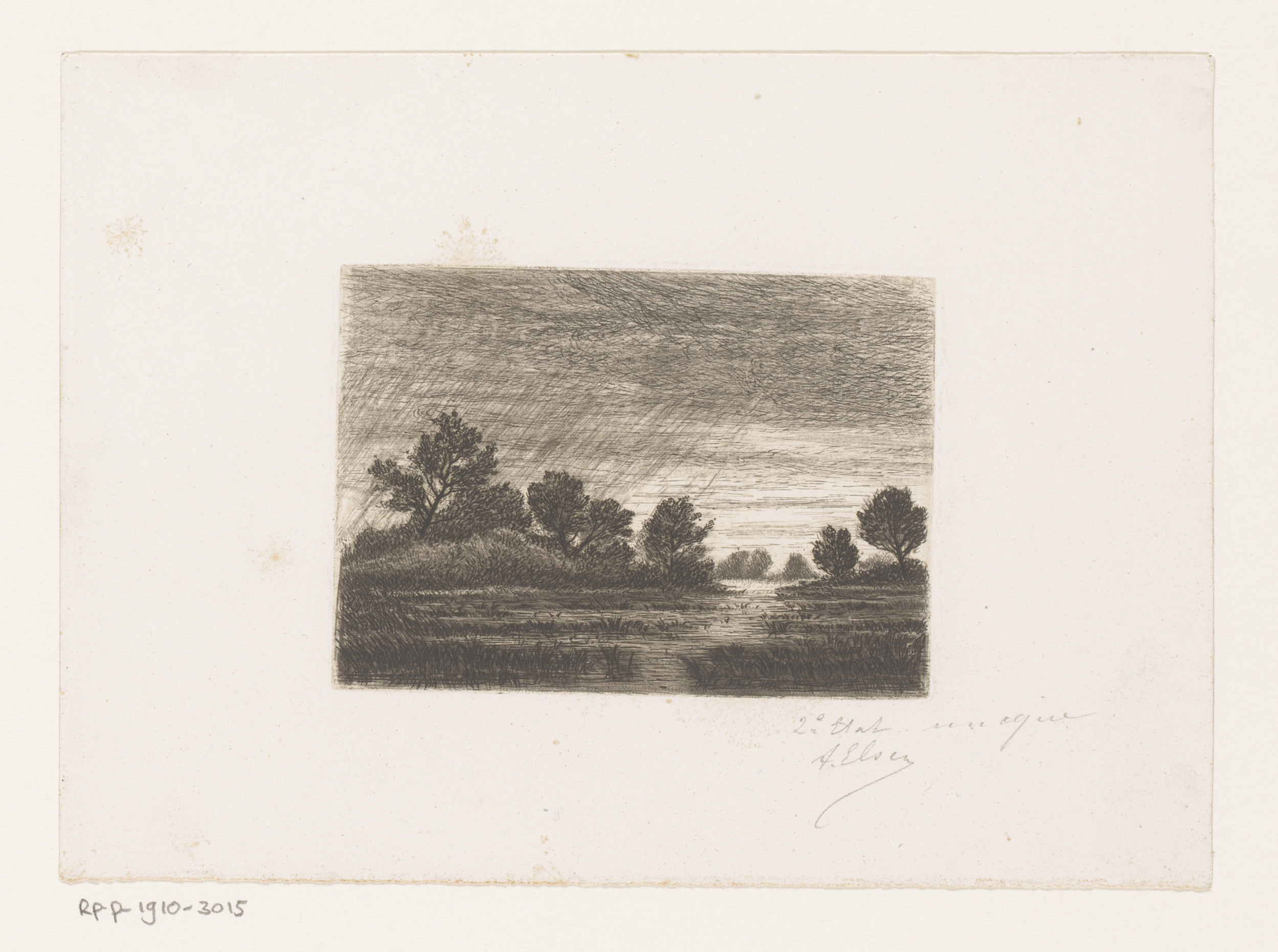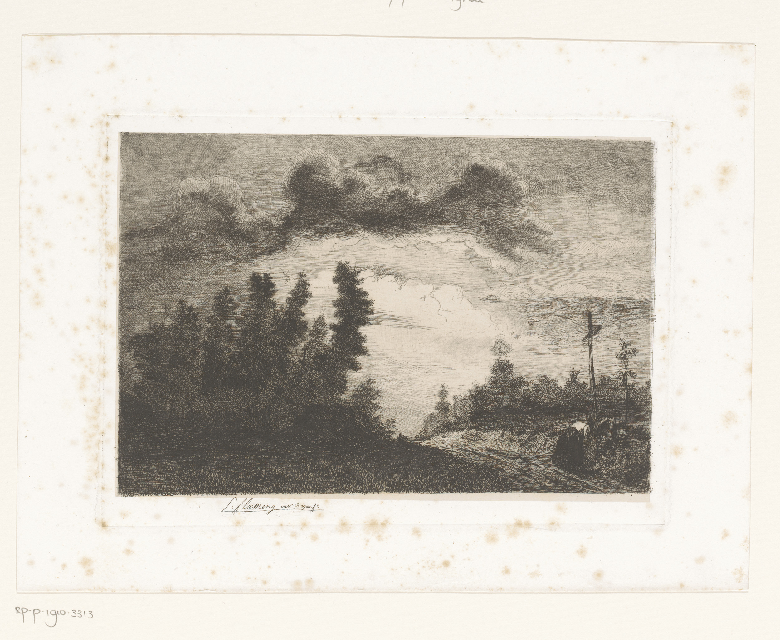 Landschap met rechts een kruis waarvoor een vrouw he...