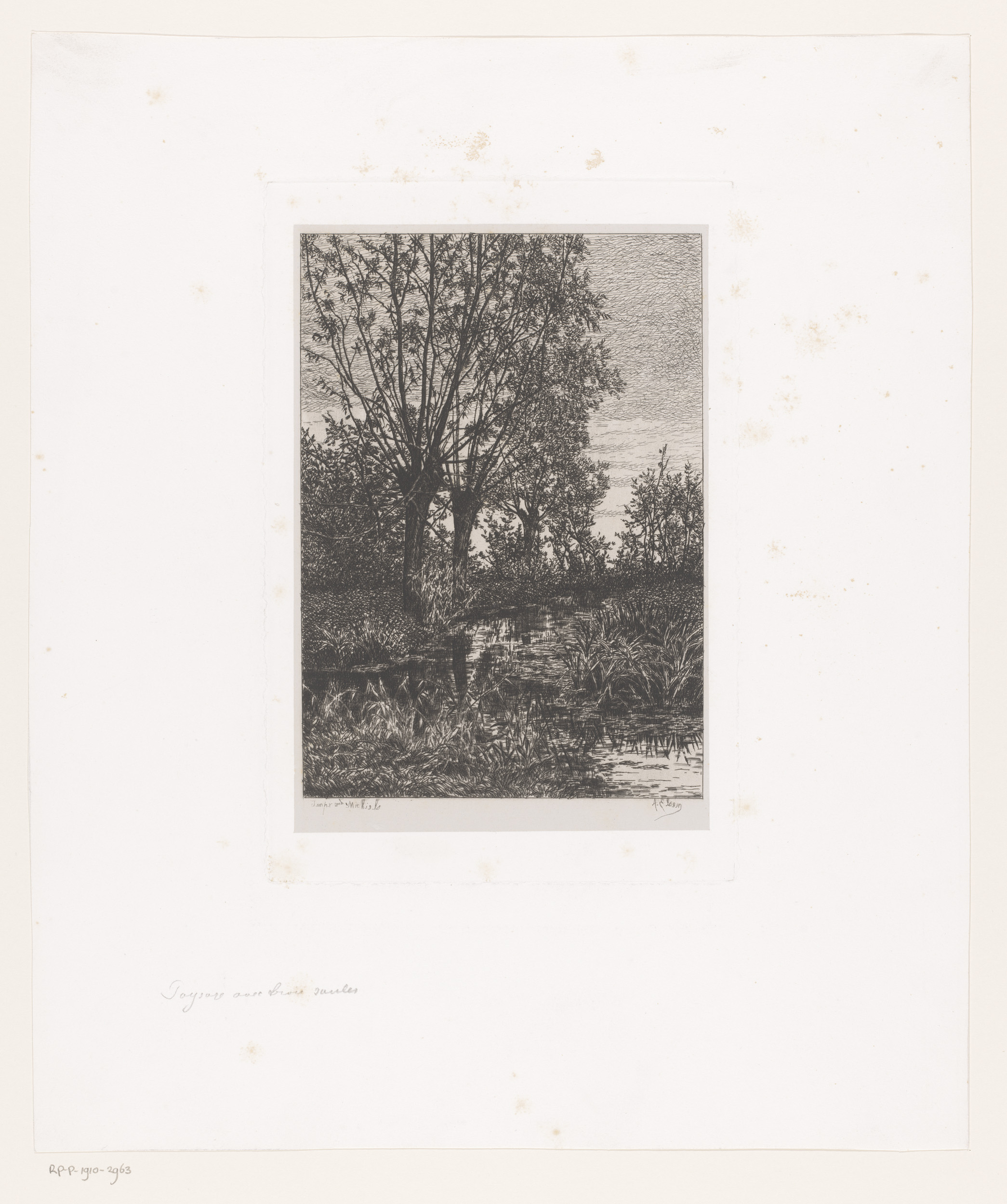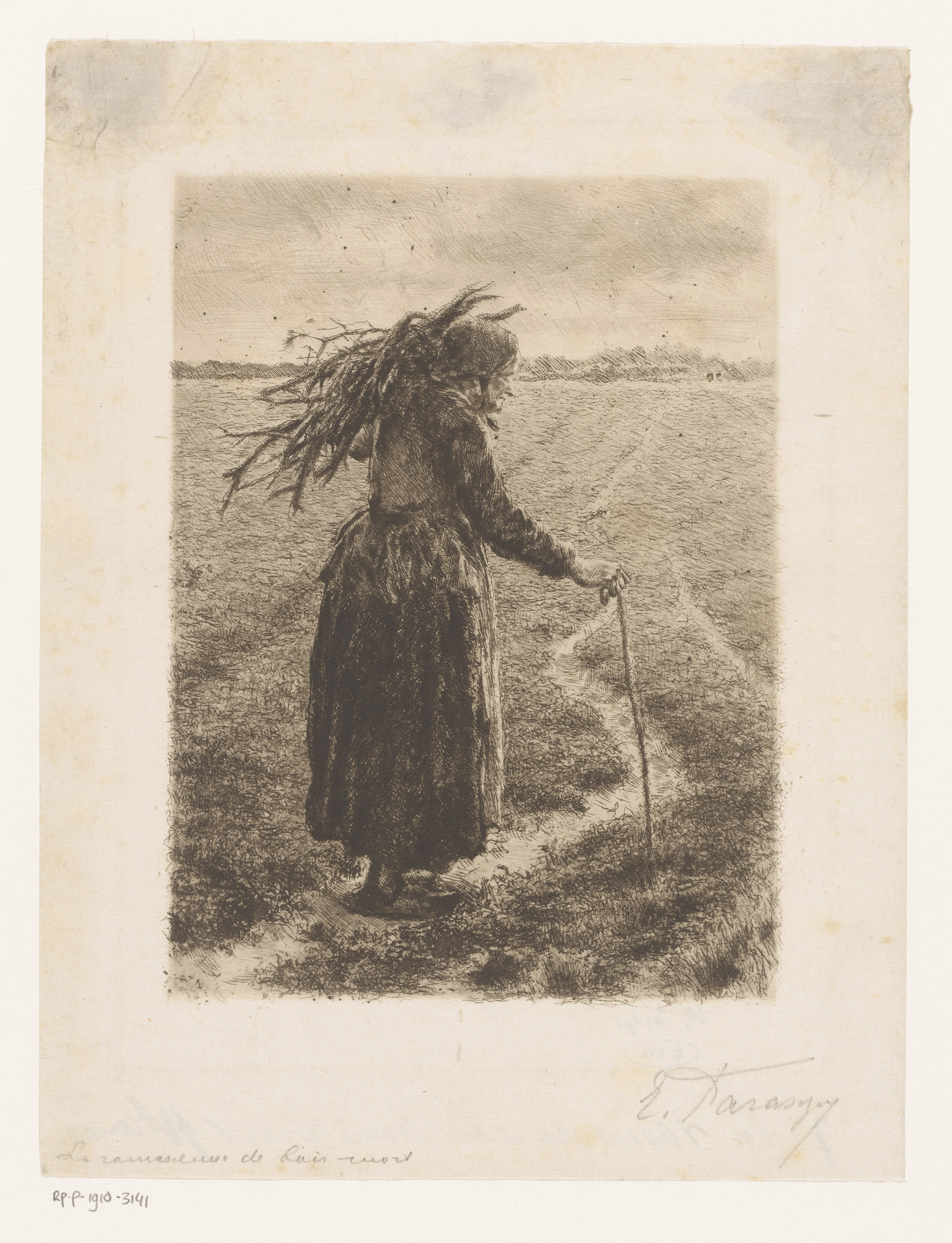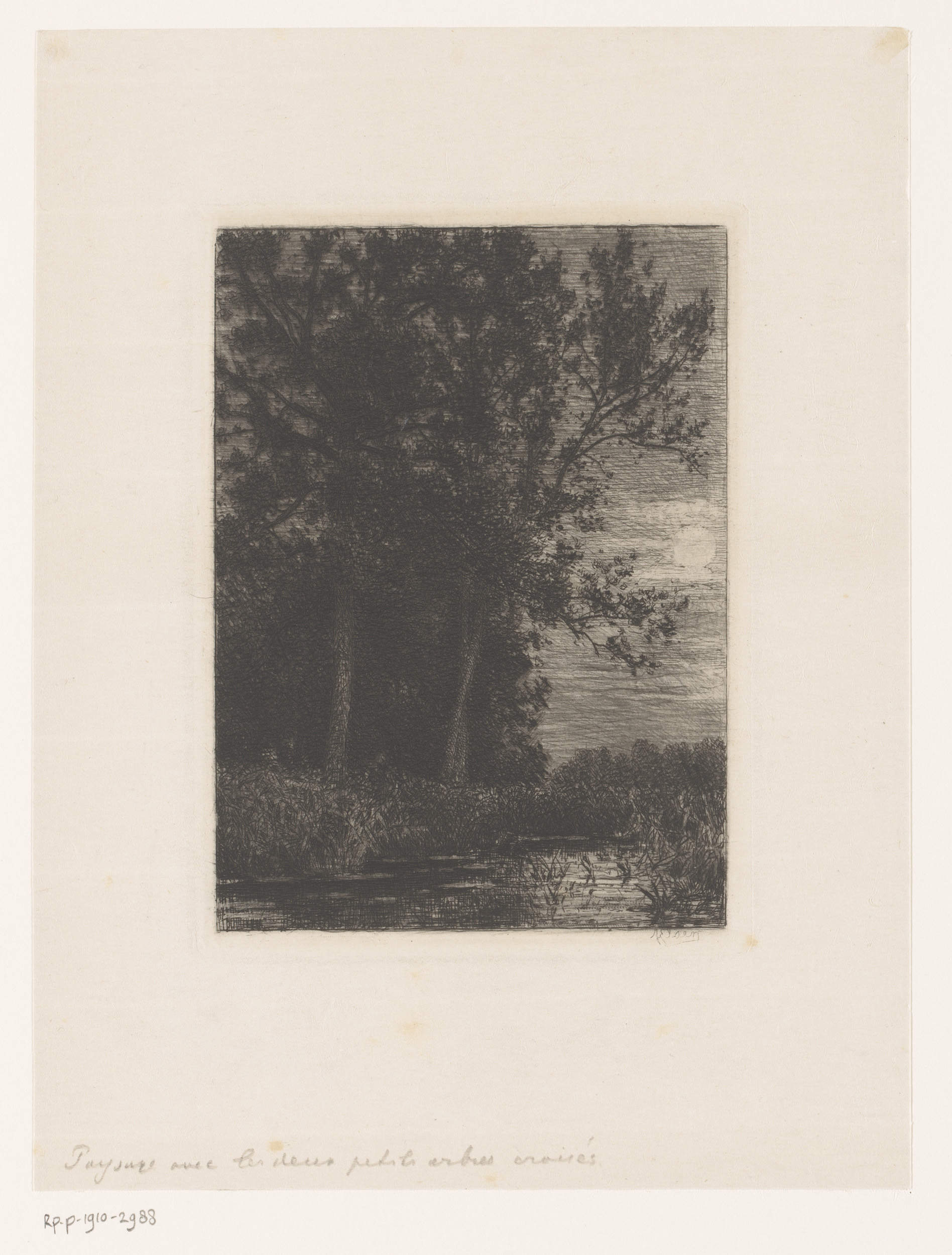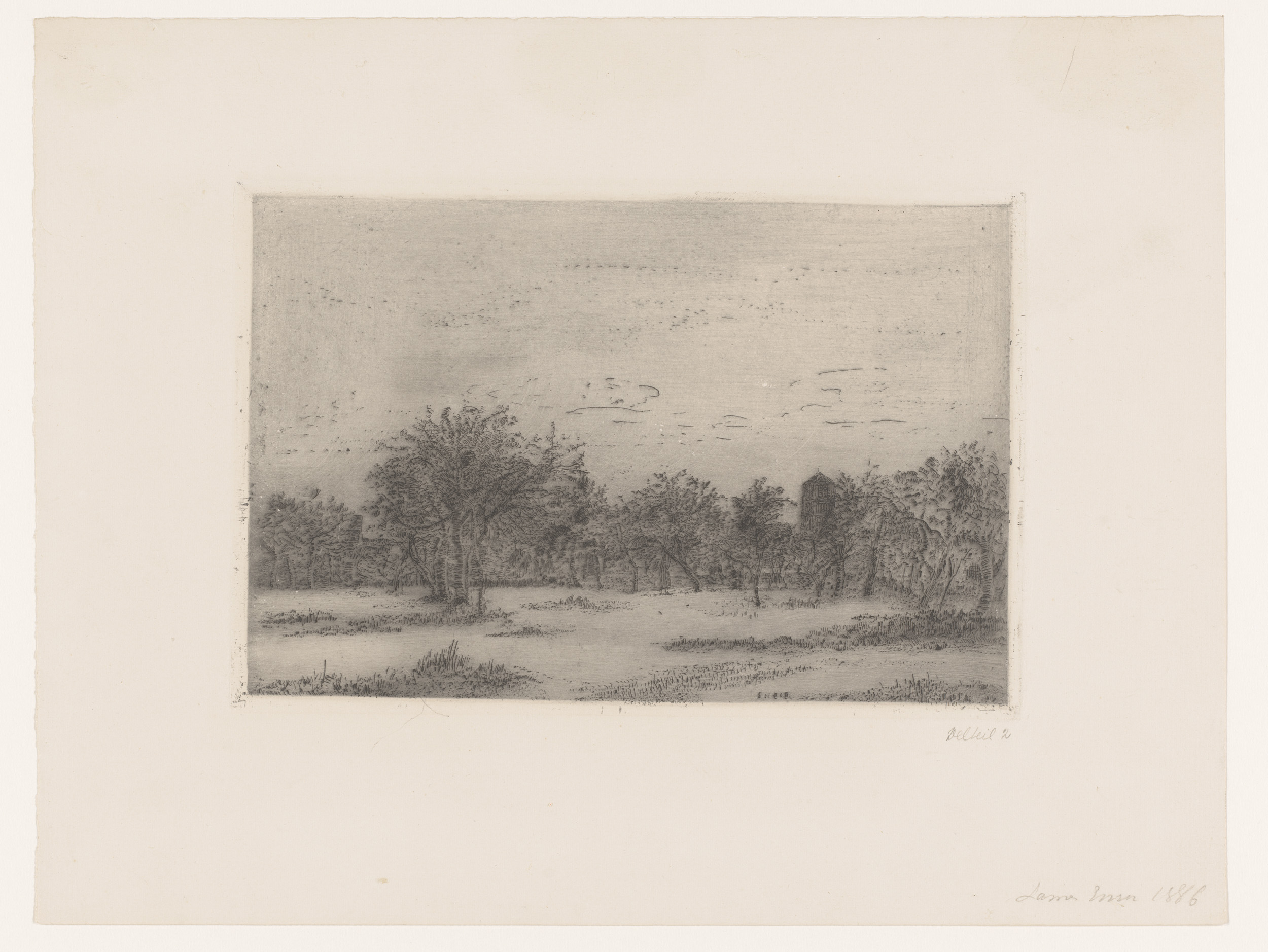 Landschap met rechts een kruis waarvoor een vrouw he...