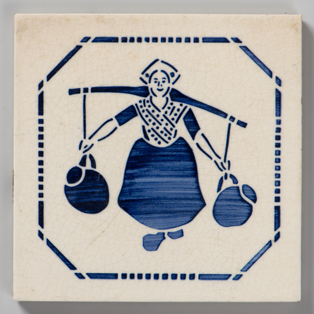 Tegel, gesjabloneerd, met voorstelling: vrouw met ju...