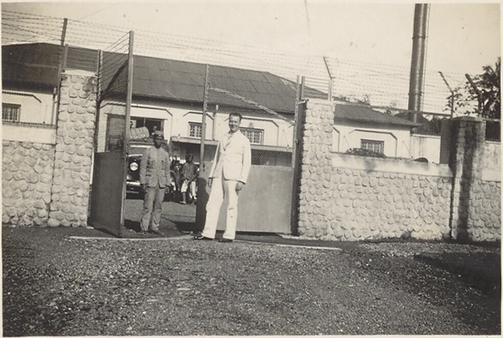De heer J. Vink voor de poort van een gevangenis