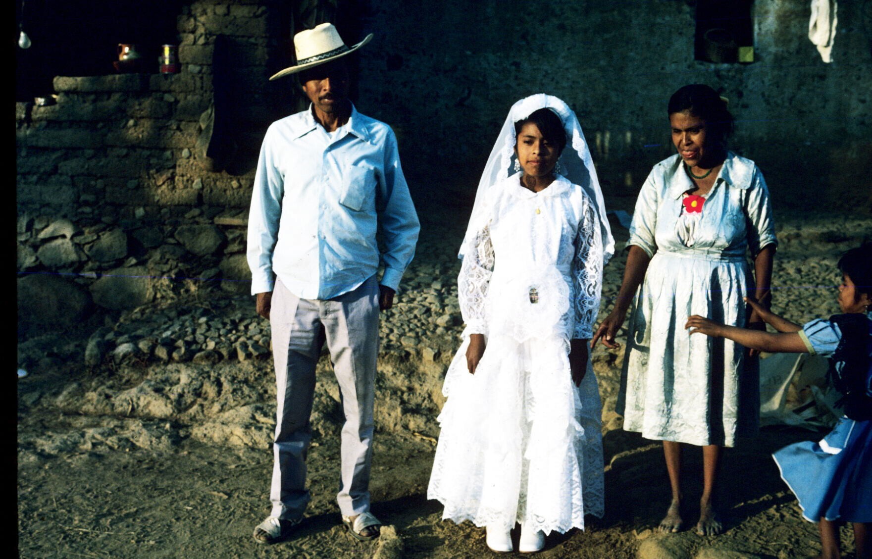 Macrina Castillo in haar Communiejurk, tussen haar o...