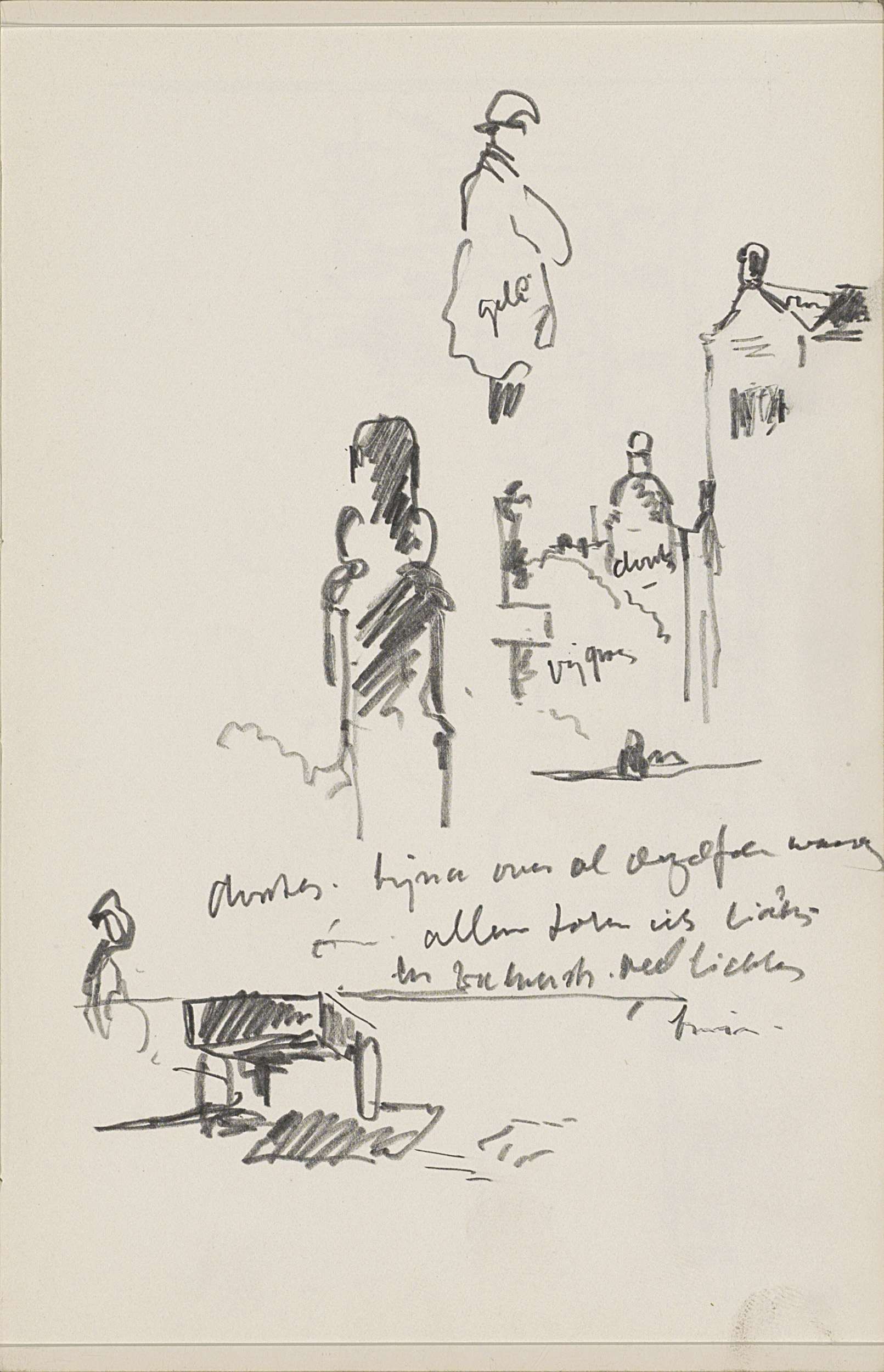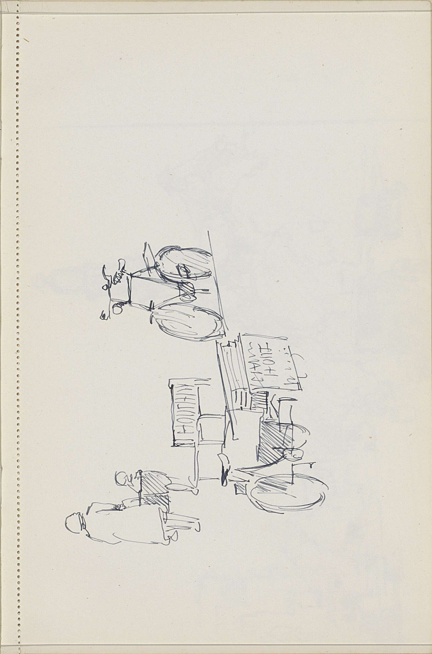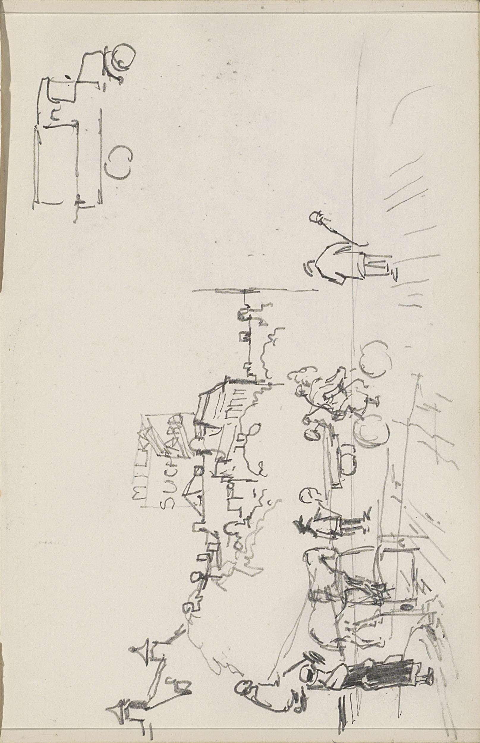 Straatgezicht met figuren en een reclamebord