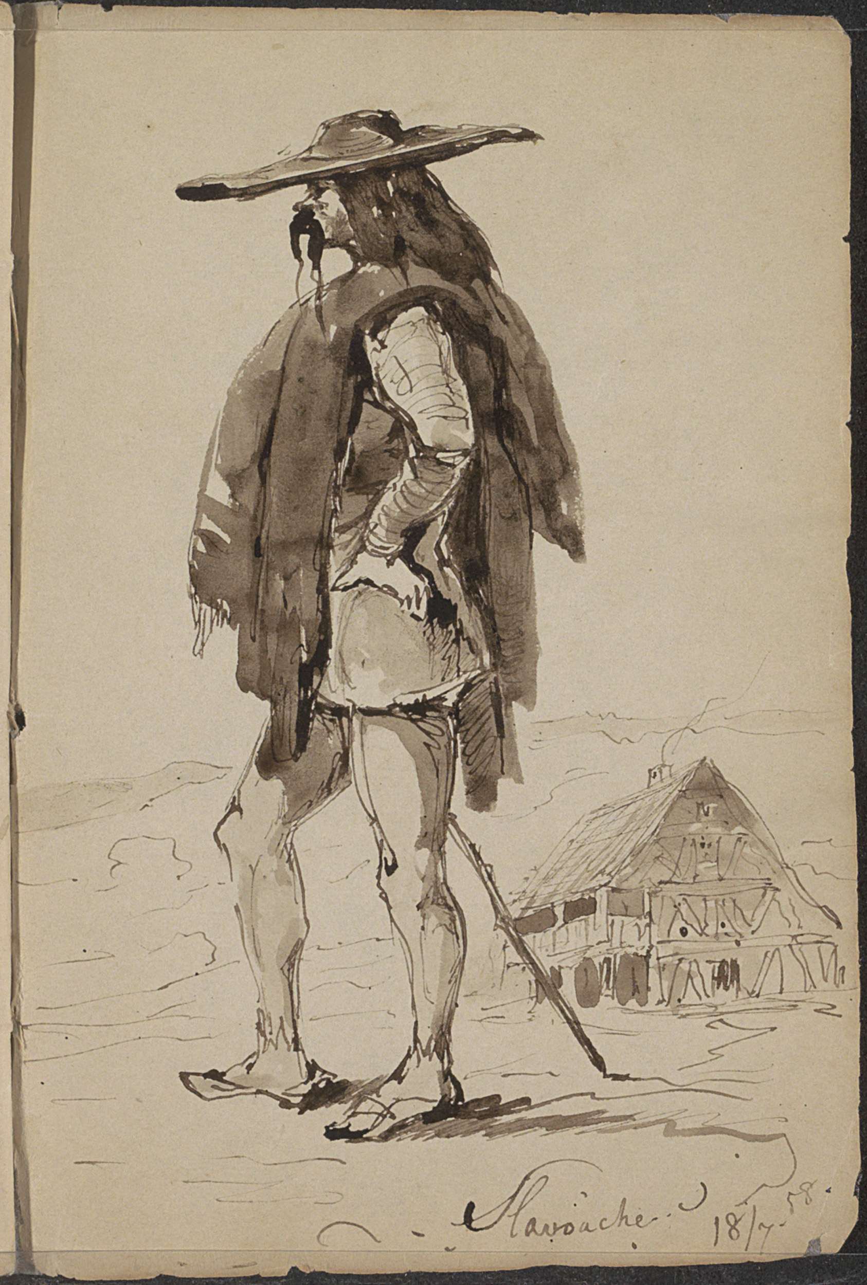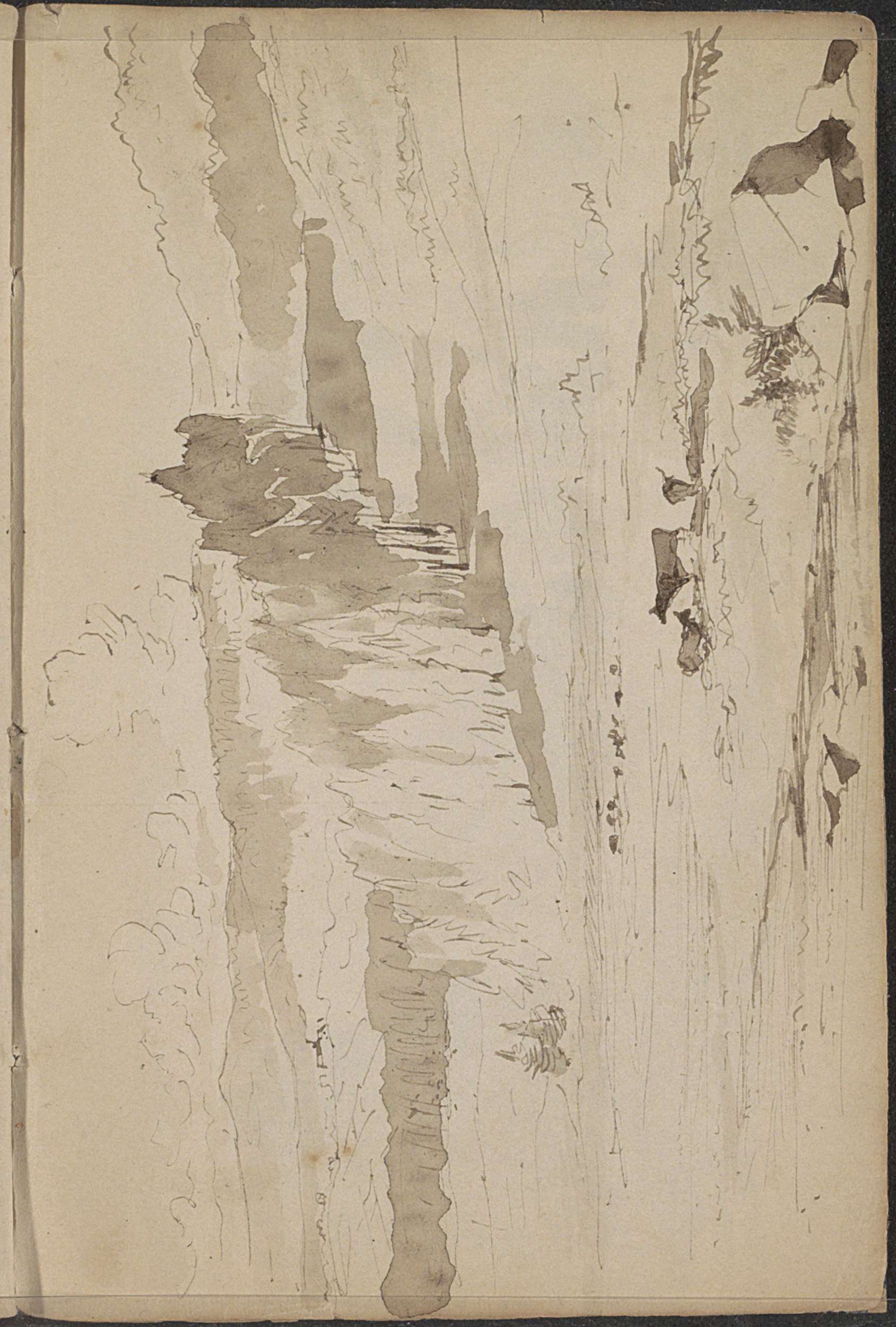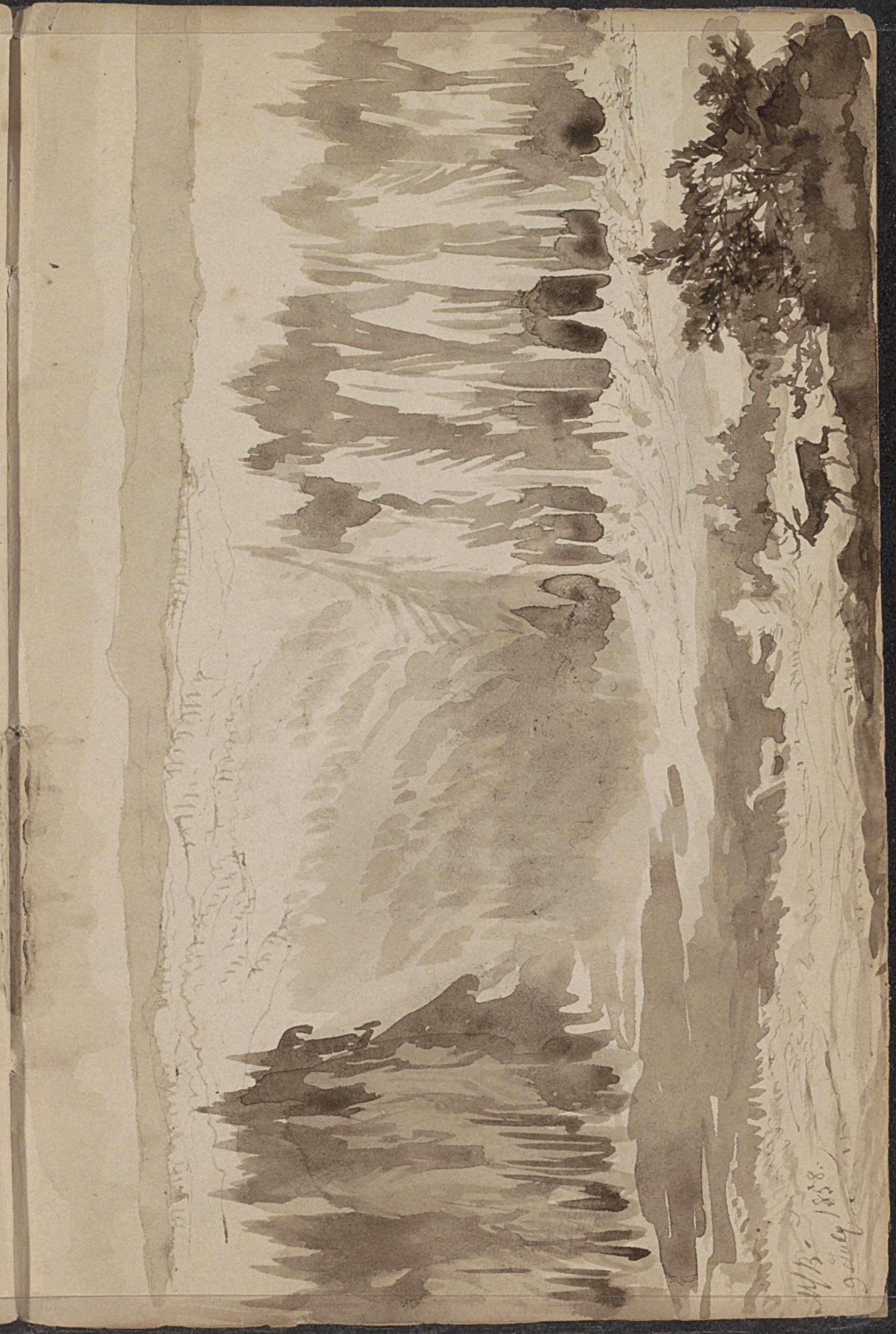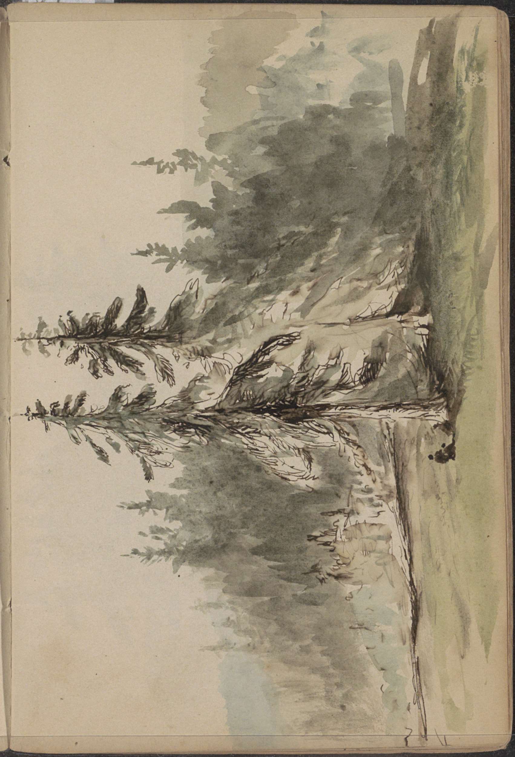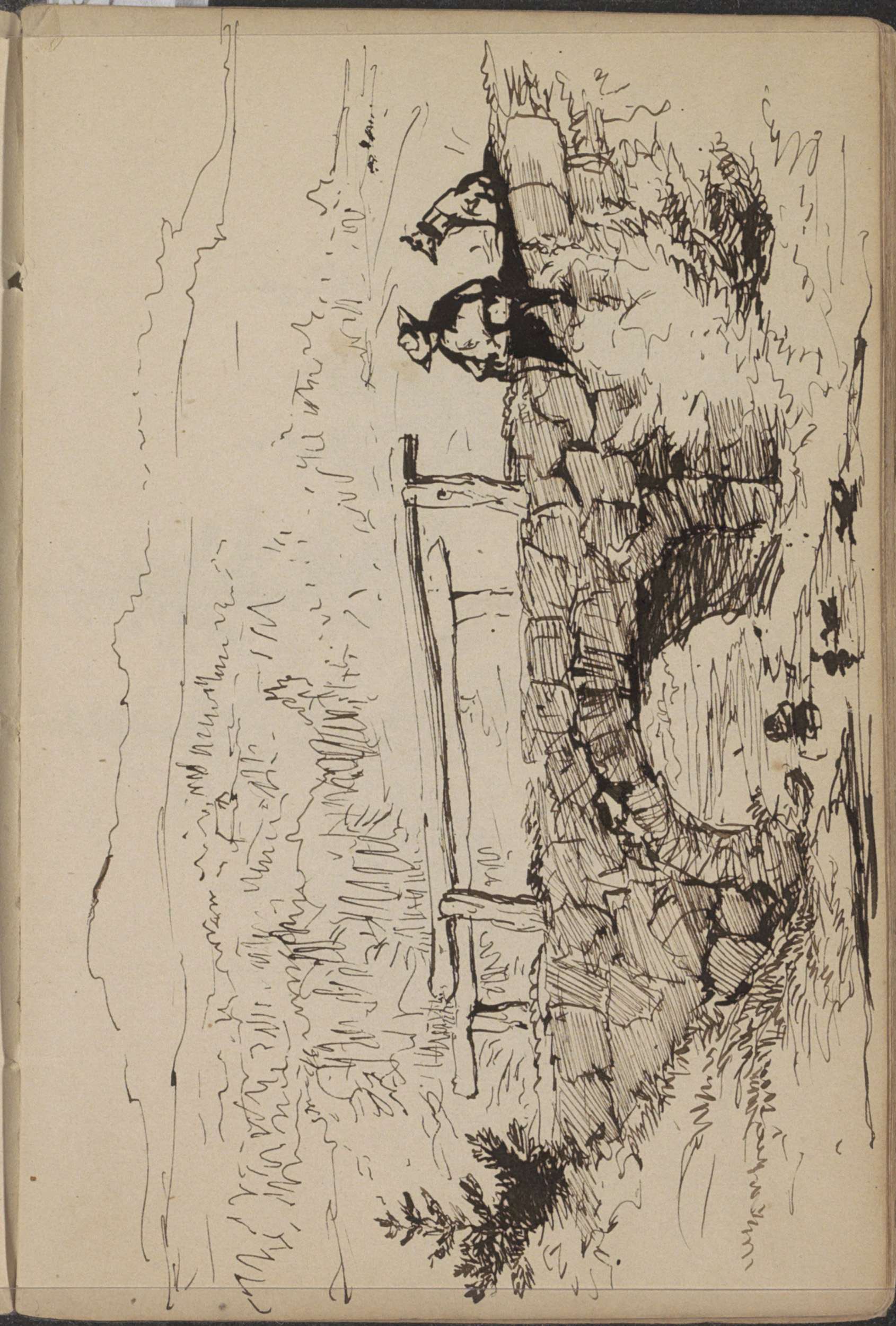 Figuur in een berglandschap met dennenbomen bij Kies...