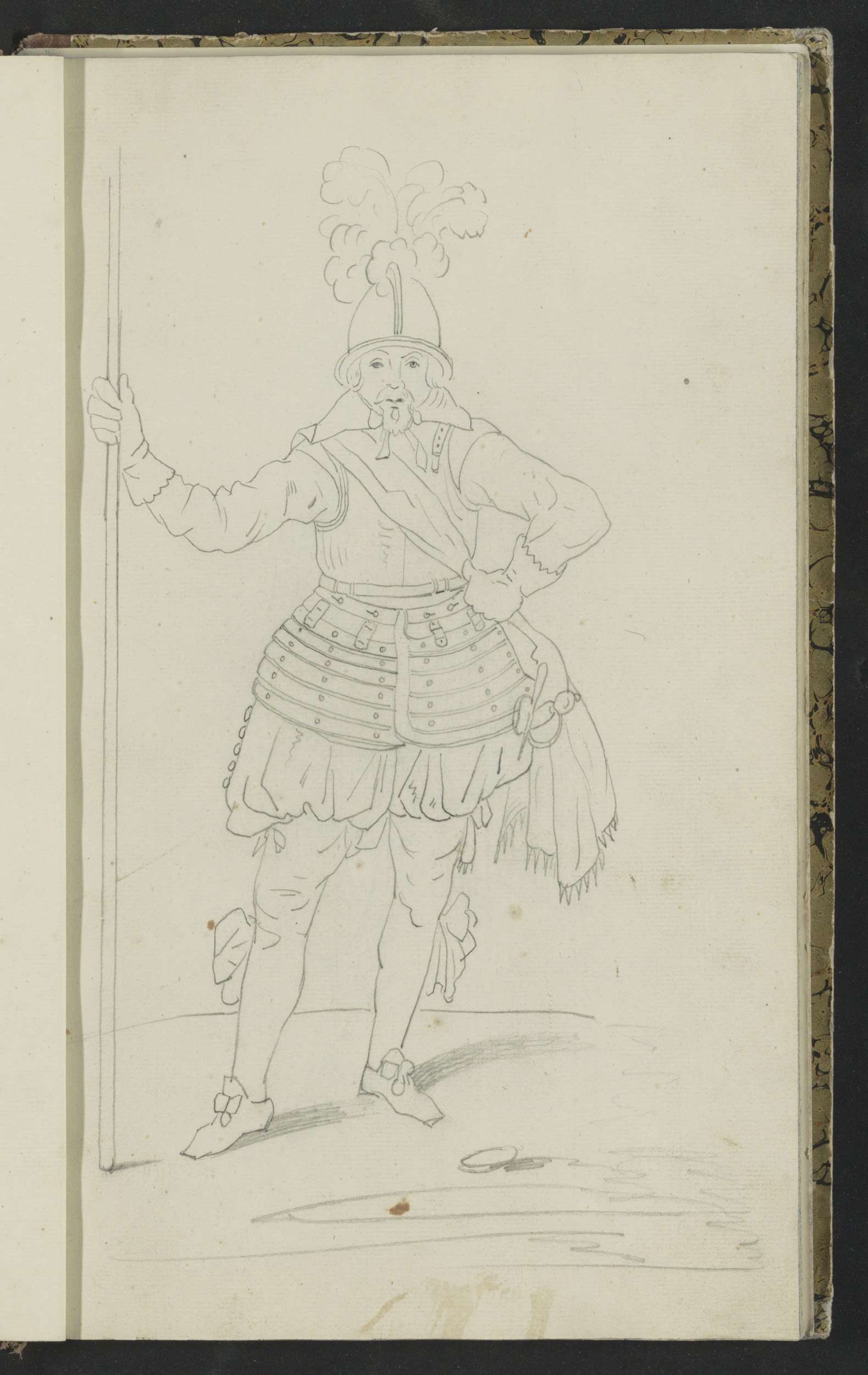 Soldaat die zijn spies met de rechterhand rechtop va...
