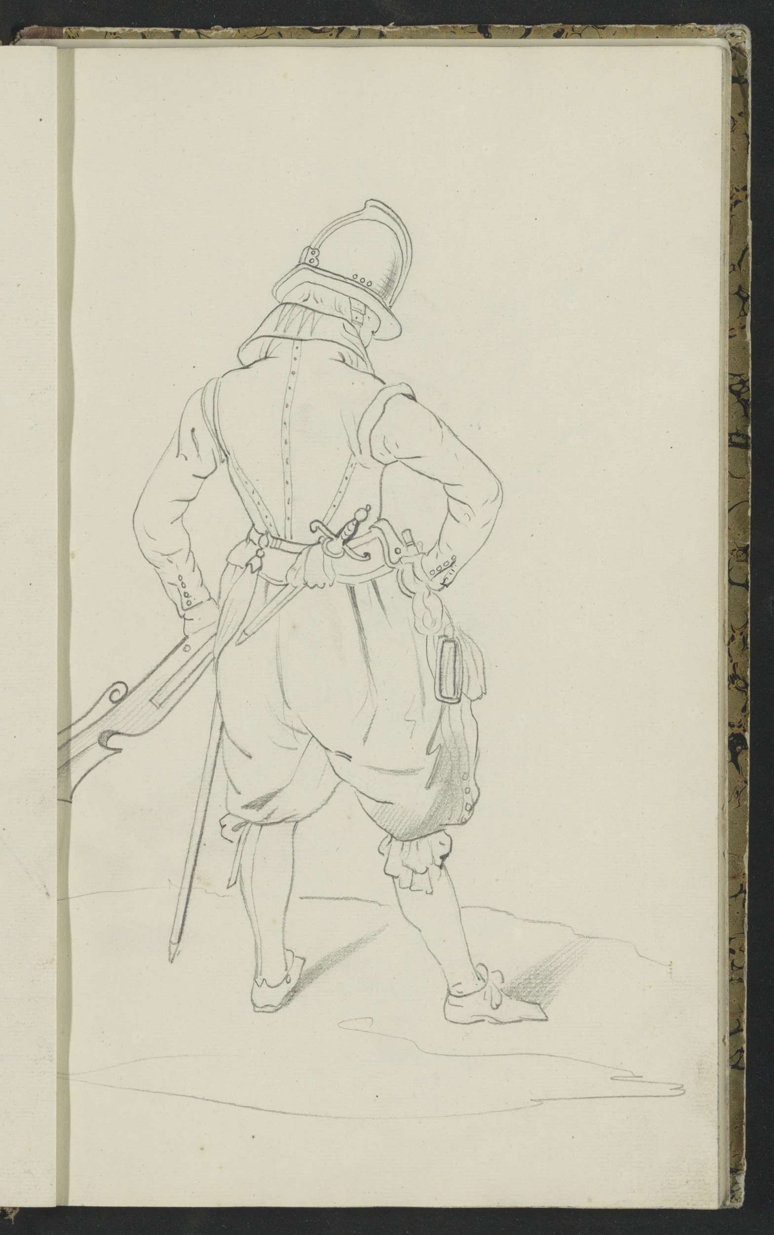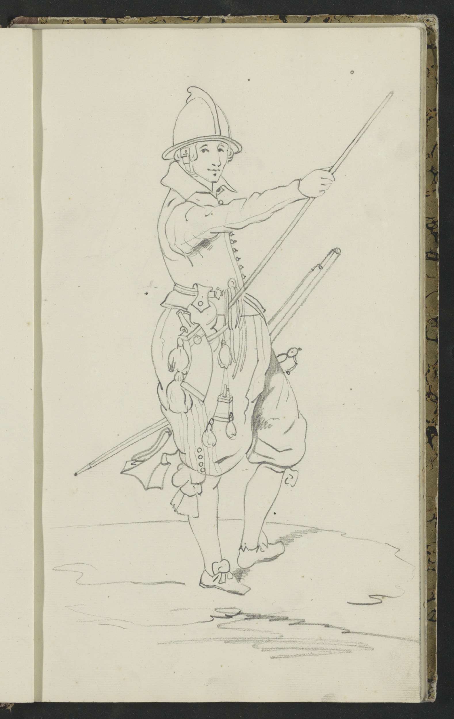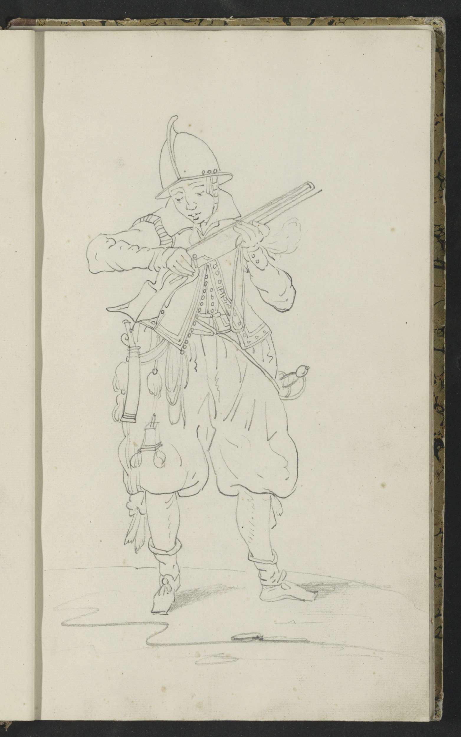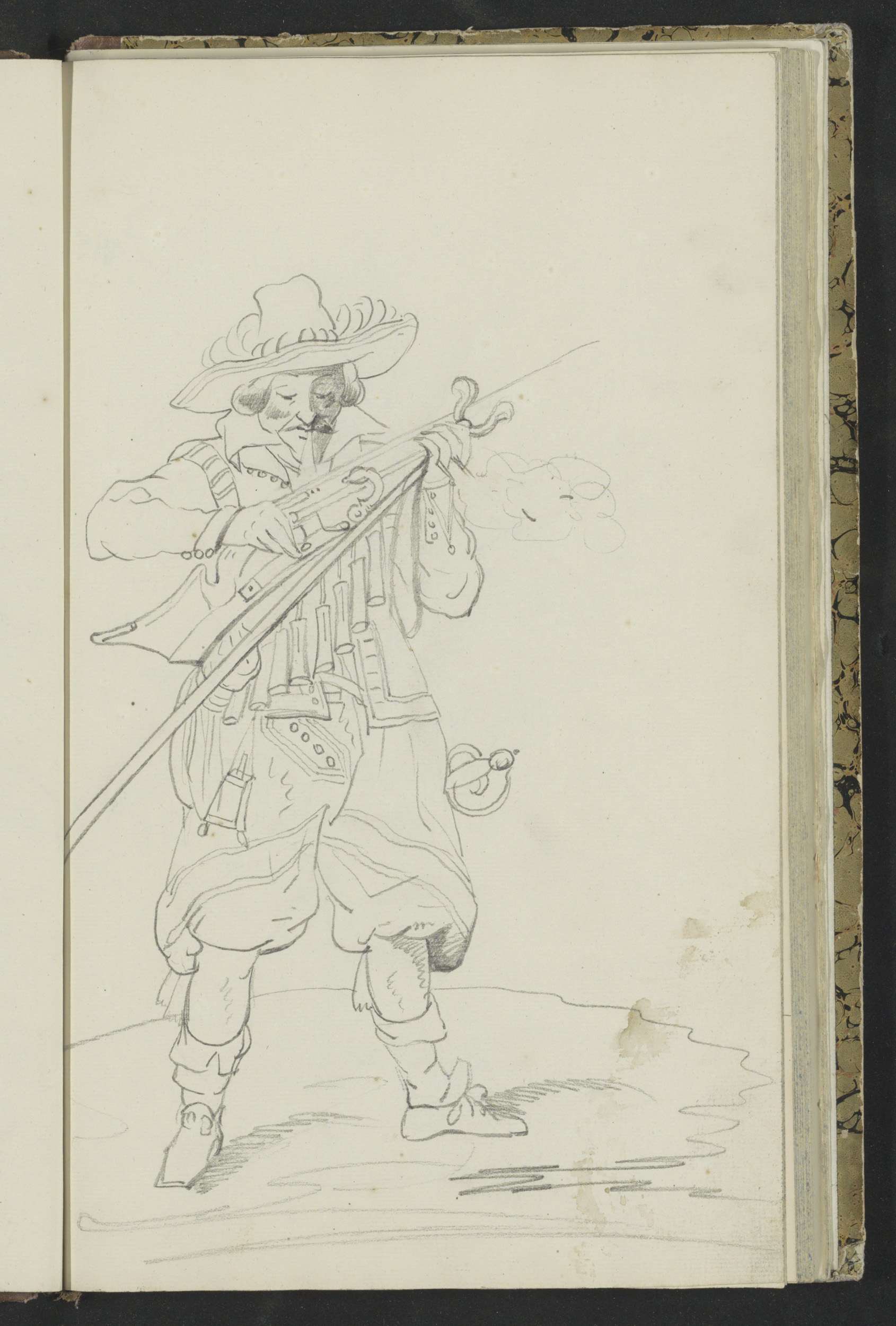 Soldaat die zijn musket op de linkerschouder draagt ...