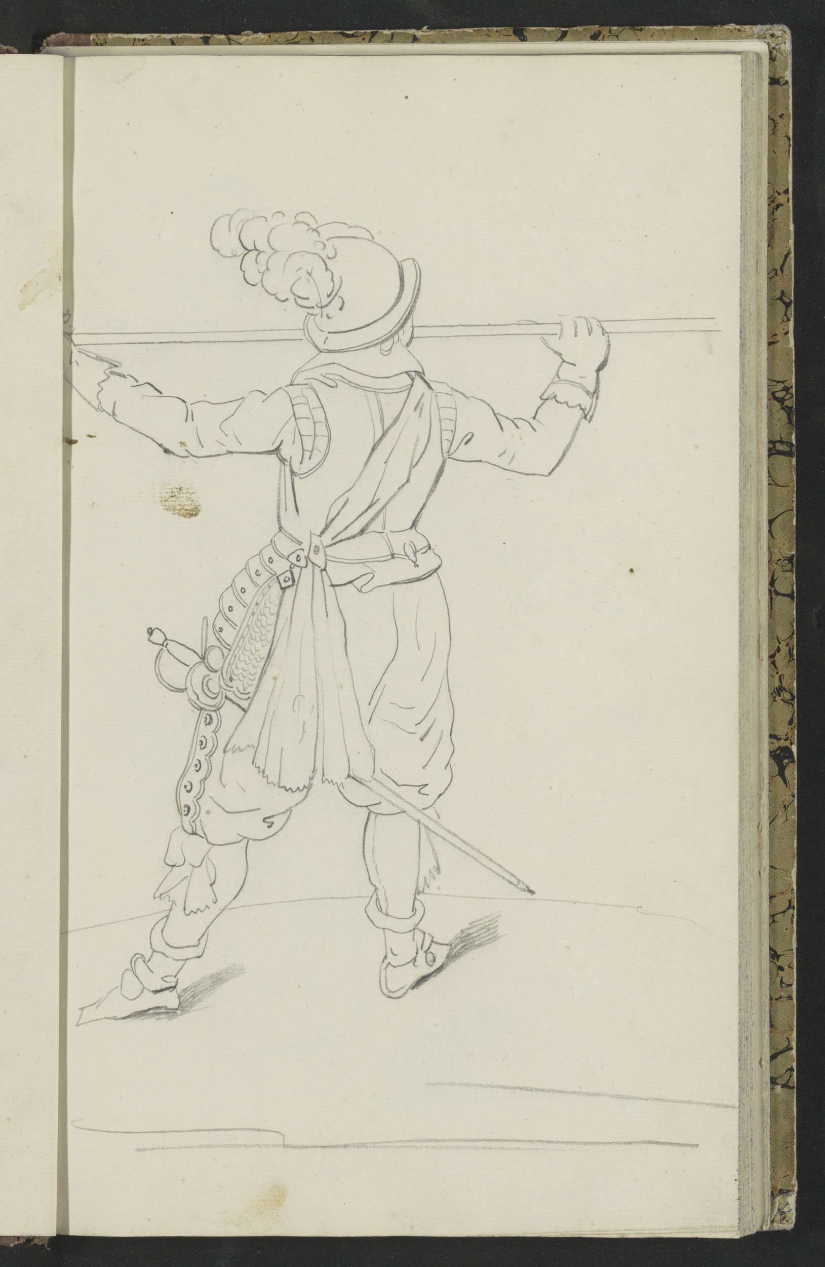 Soldaat, op de rug gezien, die zijn spies met uitges...