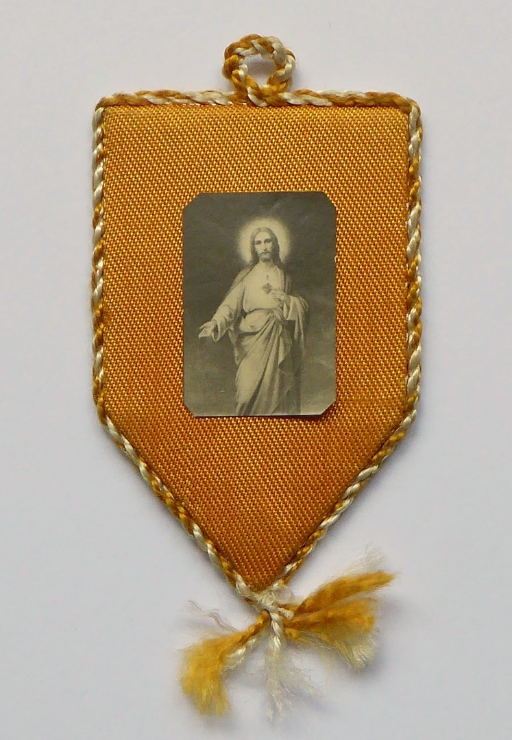 Oranje scapulier met plaatje waarop Christus van het...