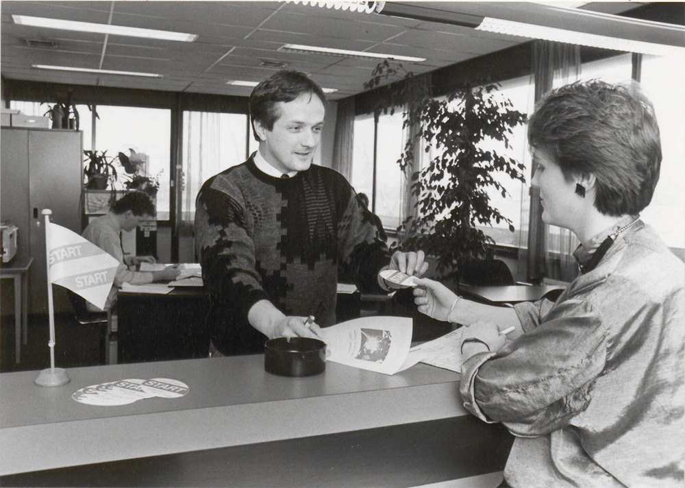 Op de foto een vrouw die een kaartje krijgt waar sta...